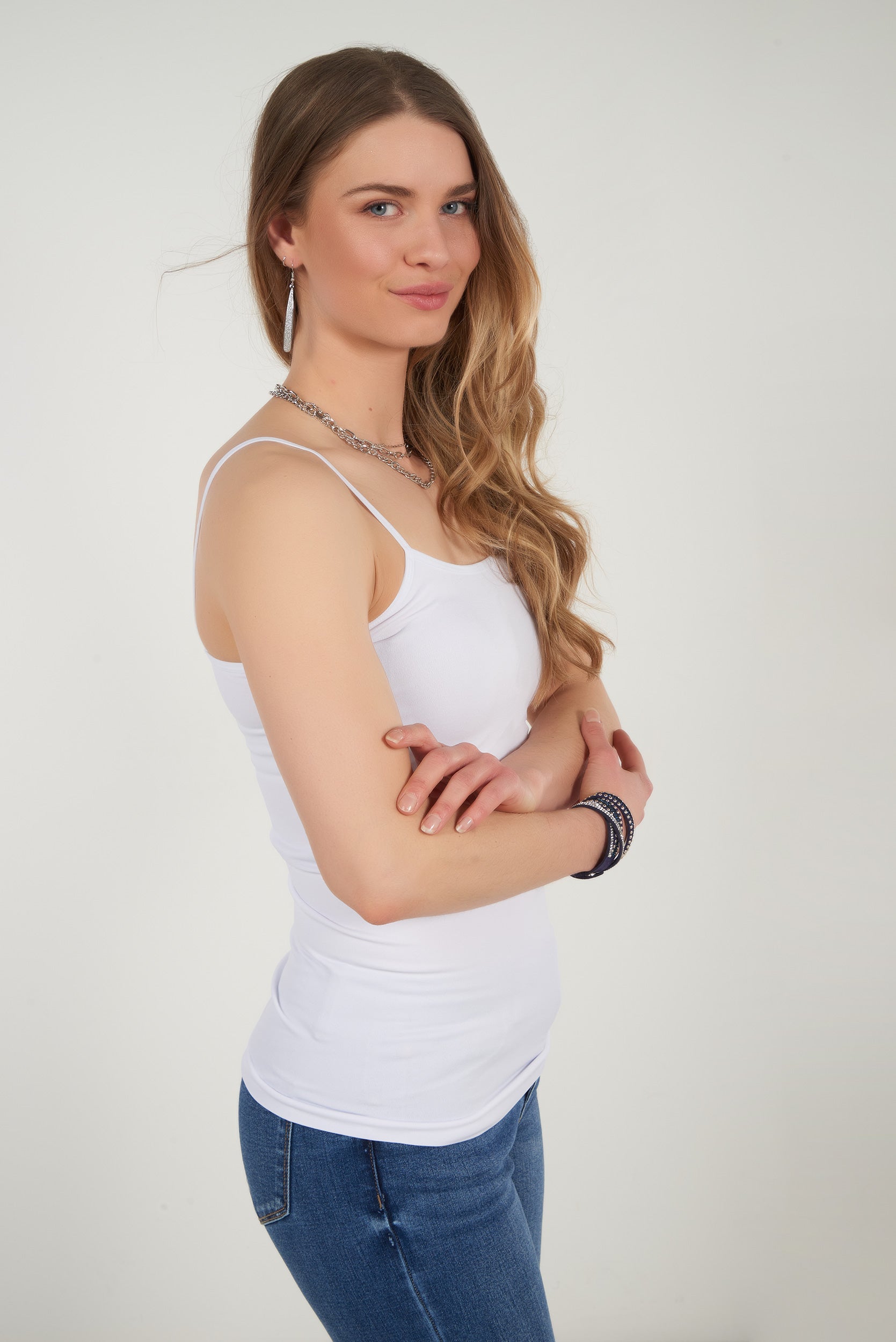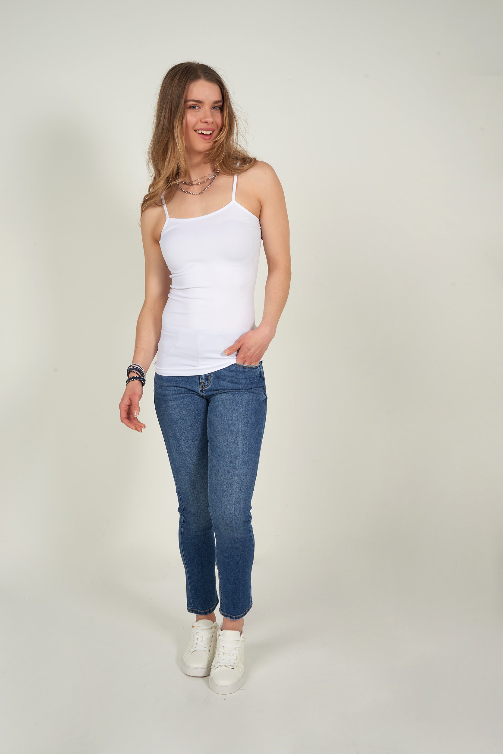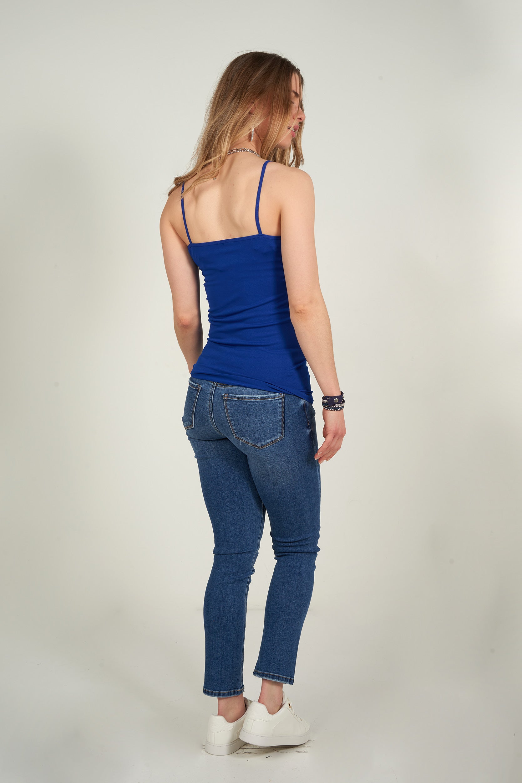 Cette camisole à bretelles fines offre un style féminin et intemporel qui met délicatement la silhouette en valeur. Son tissu doux, extensible et confortable épouse le corps sans comprimer, idéal pour un port quotidien.