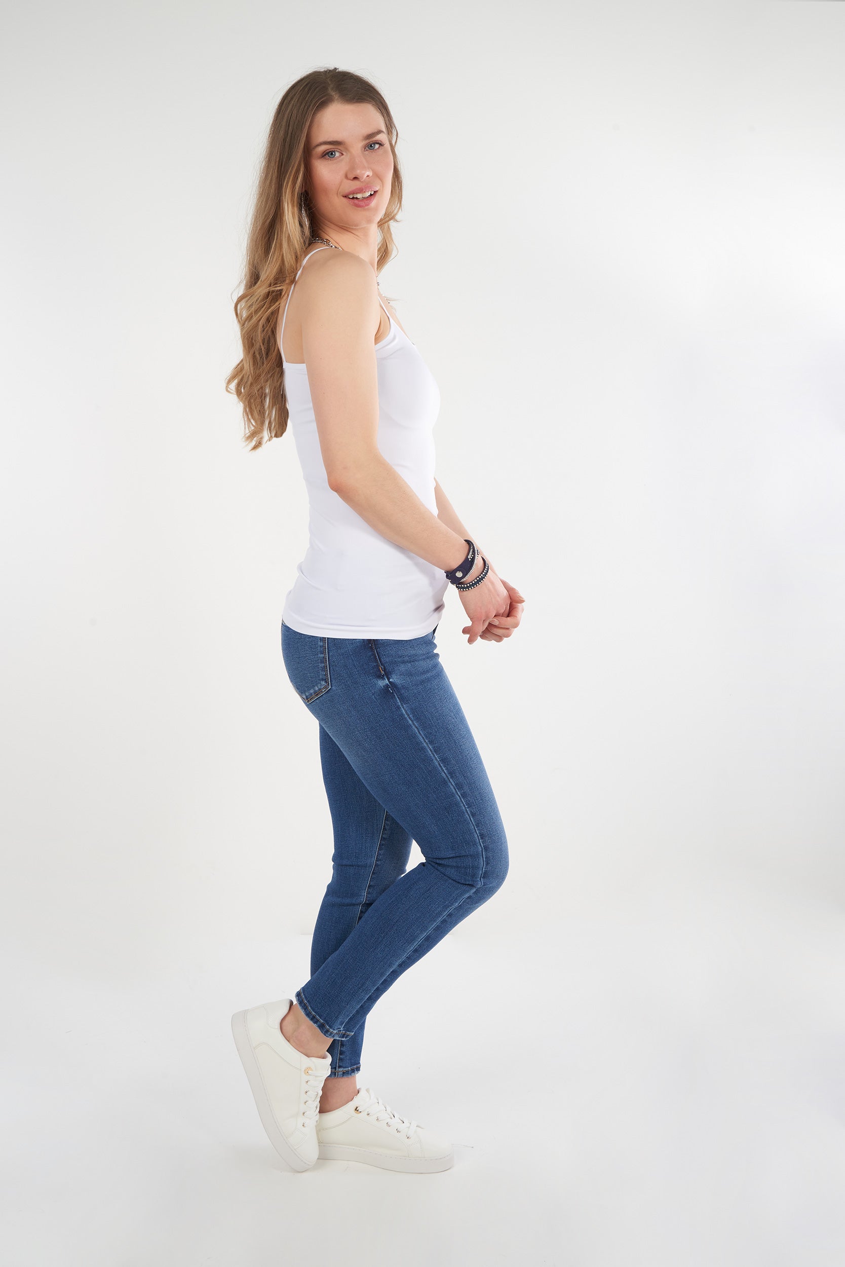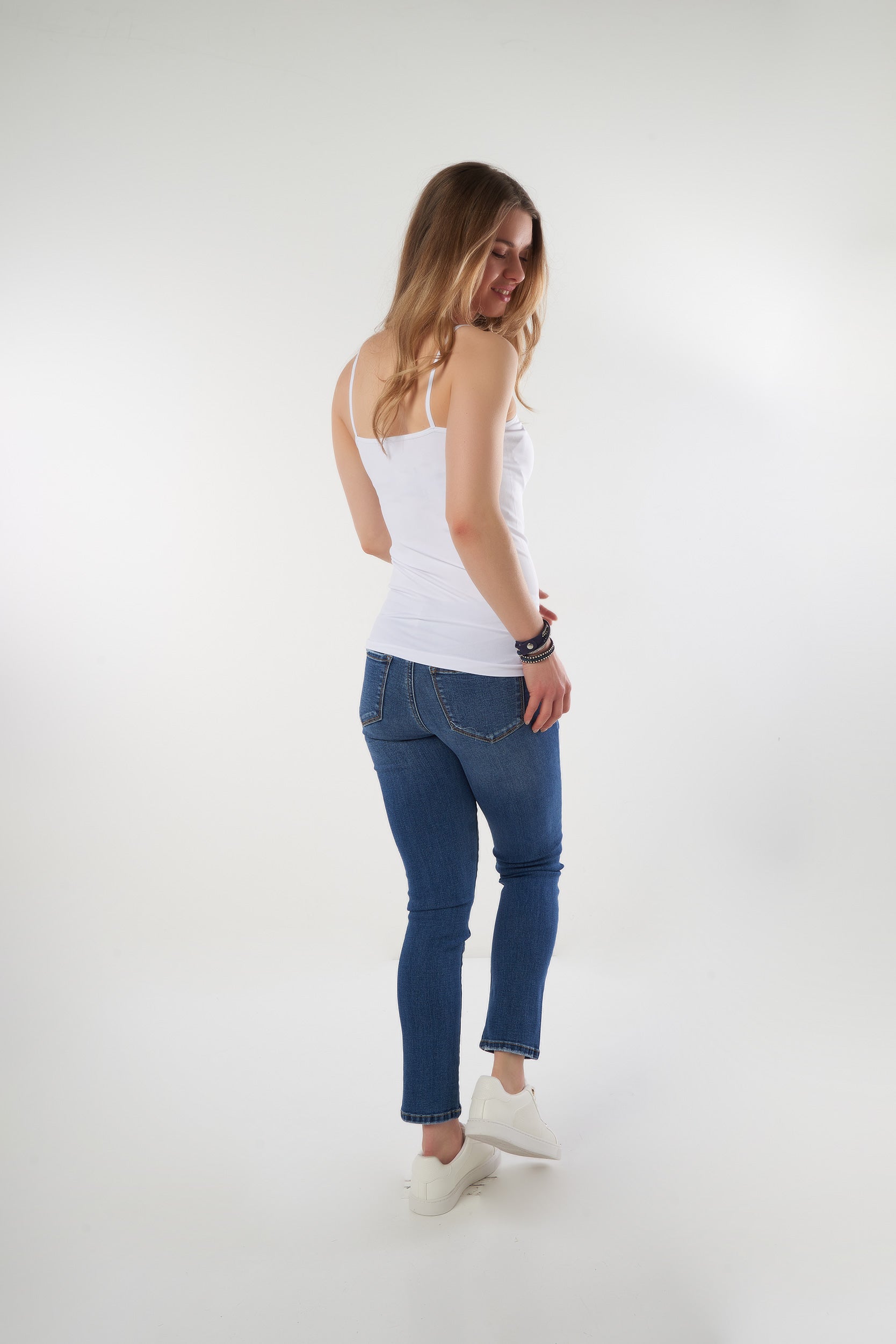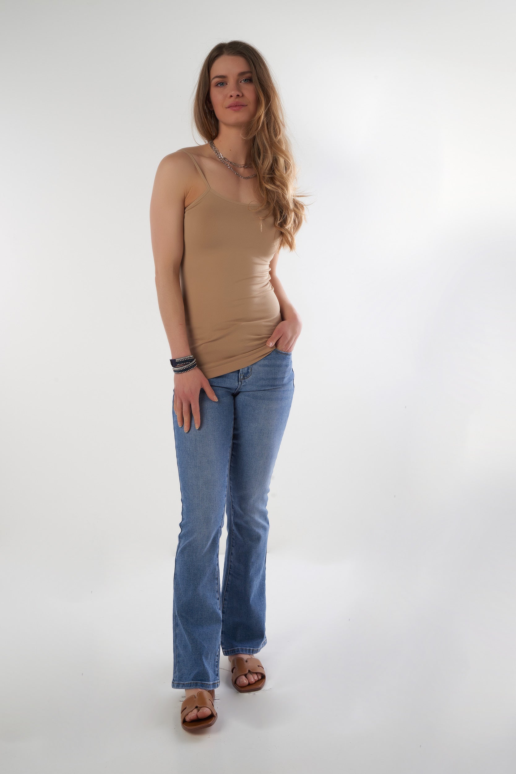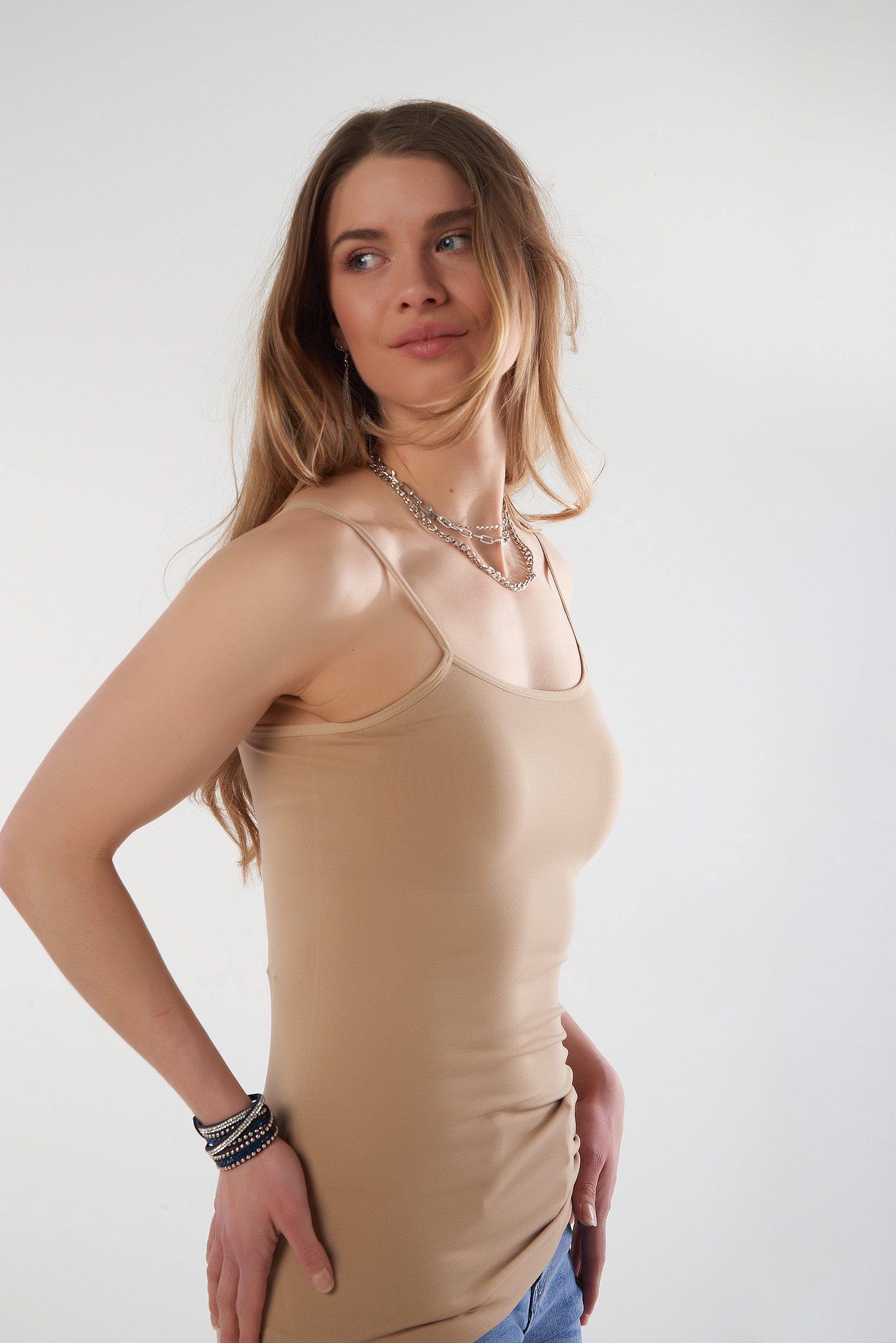 Cette camisole à bretelles fines offre un style féminin et intemporel qui met délicatement la silhouette en valeur. Son tissu doux, extensible et confortable épouse le corps sans comprimer, idéal pour un port quotidien.