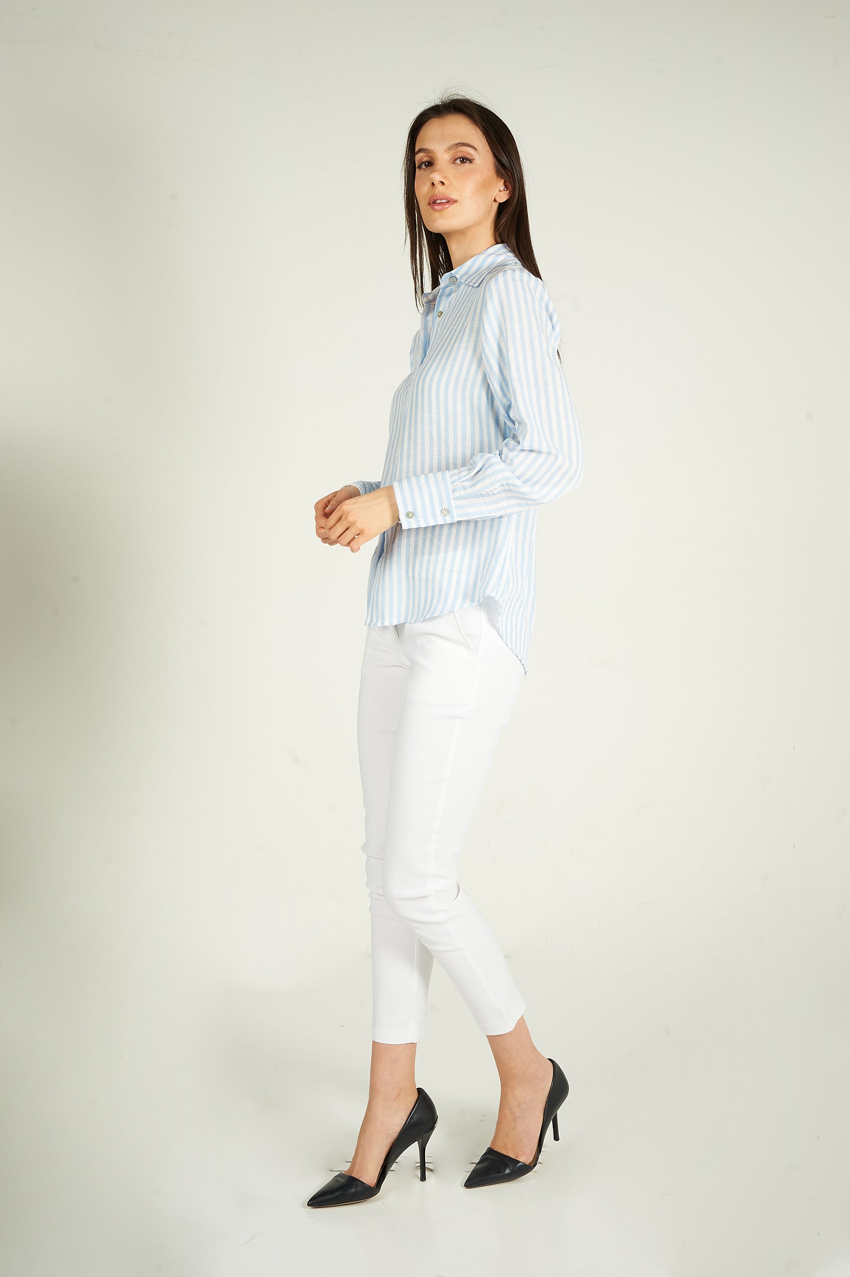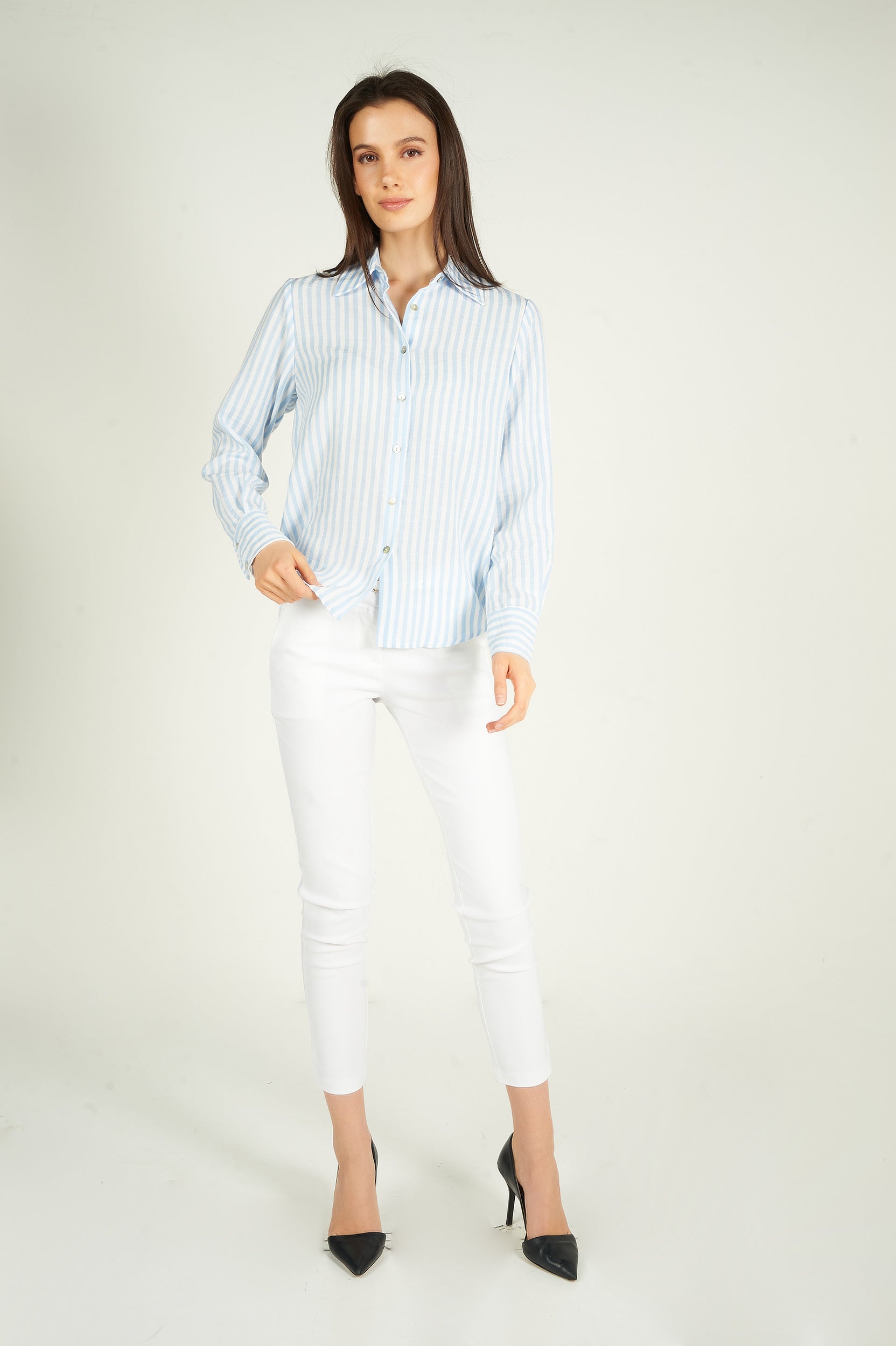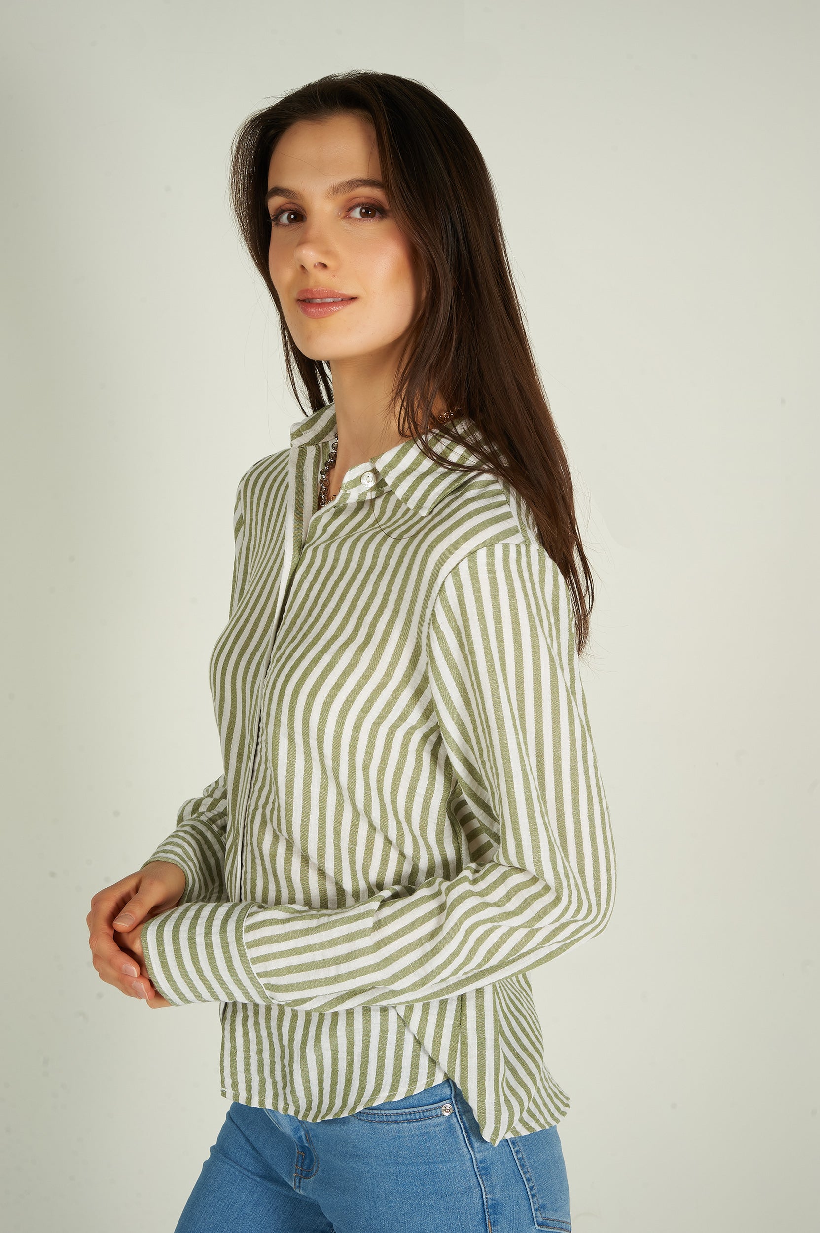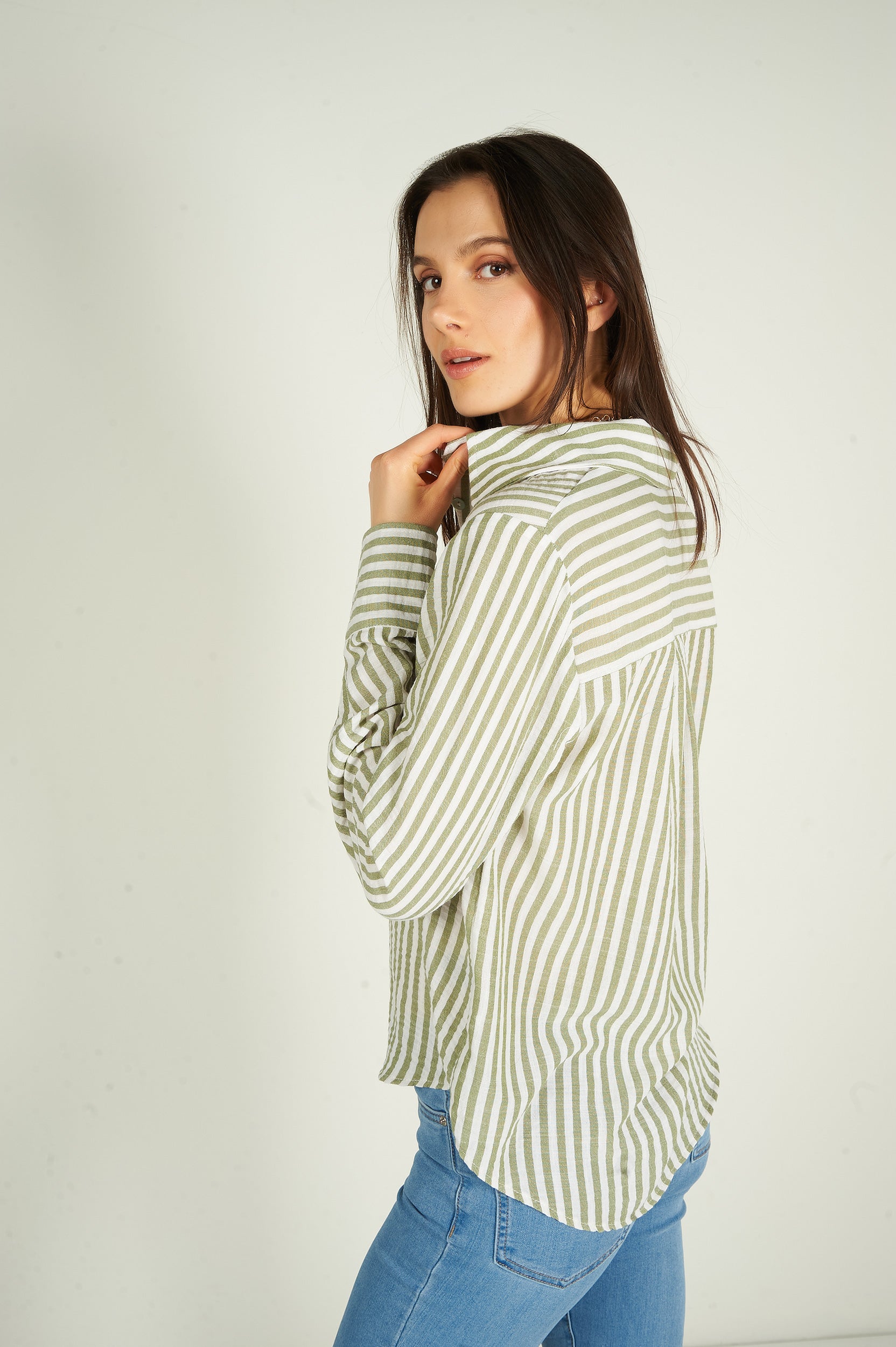 Rehaussez votre garde-robe avec la blouse pour femme Goldy, une blouse chic et polyvalente. Ce chemisier à rayures est tendance et élégant. 2 choix : blouse blanche et bleue, blouse blanche et verte.