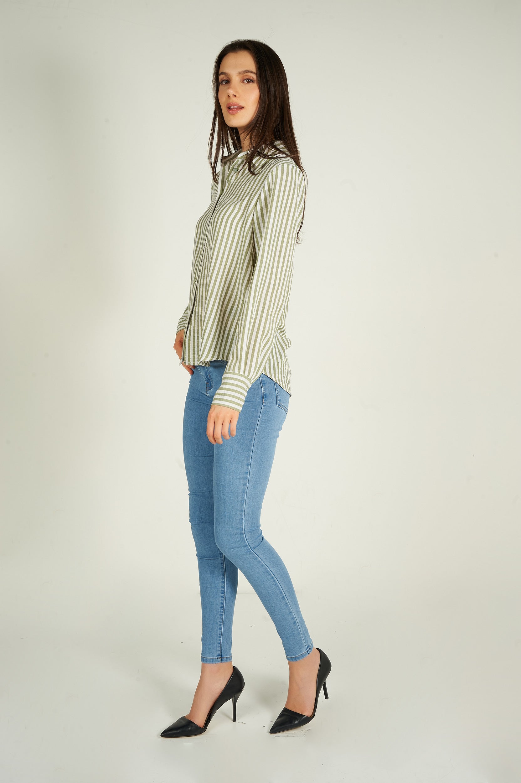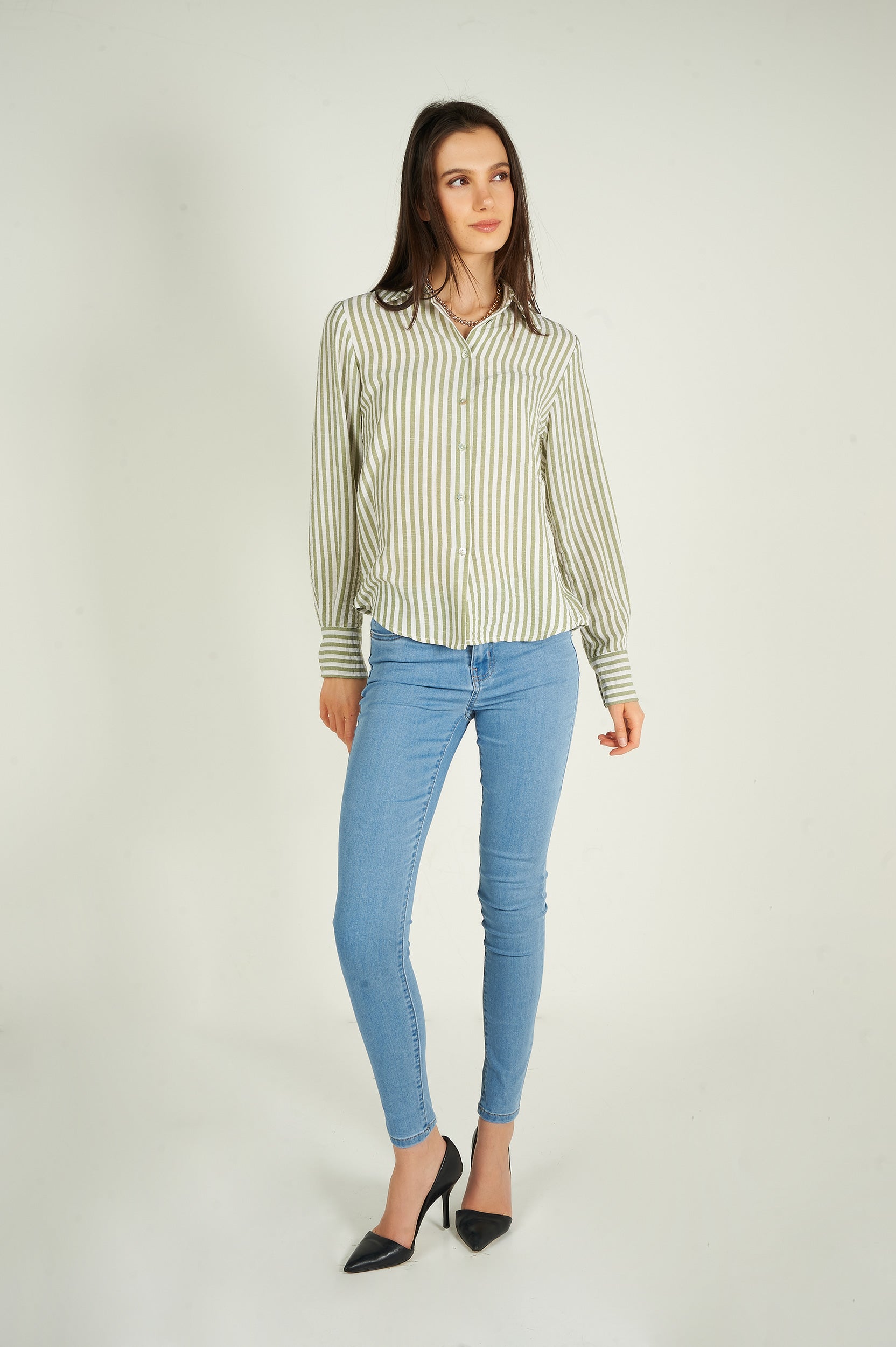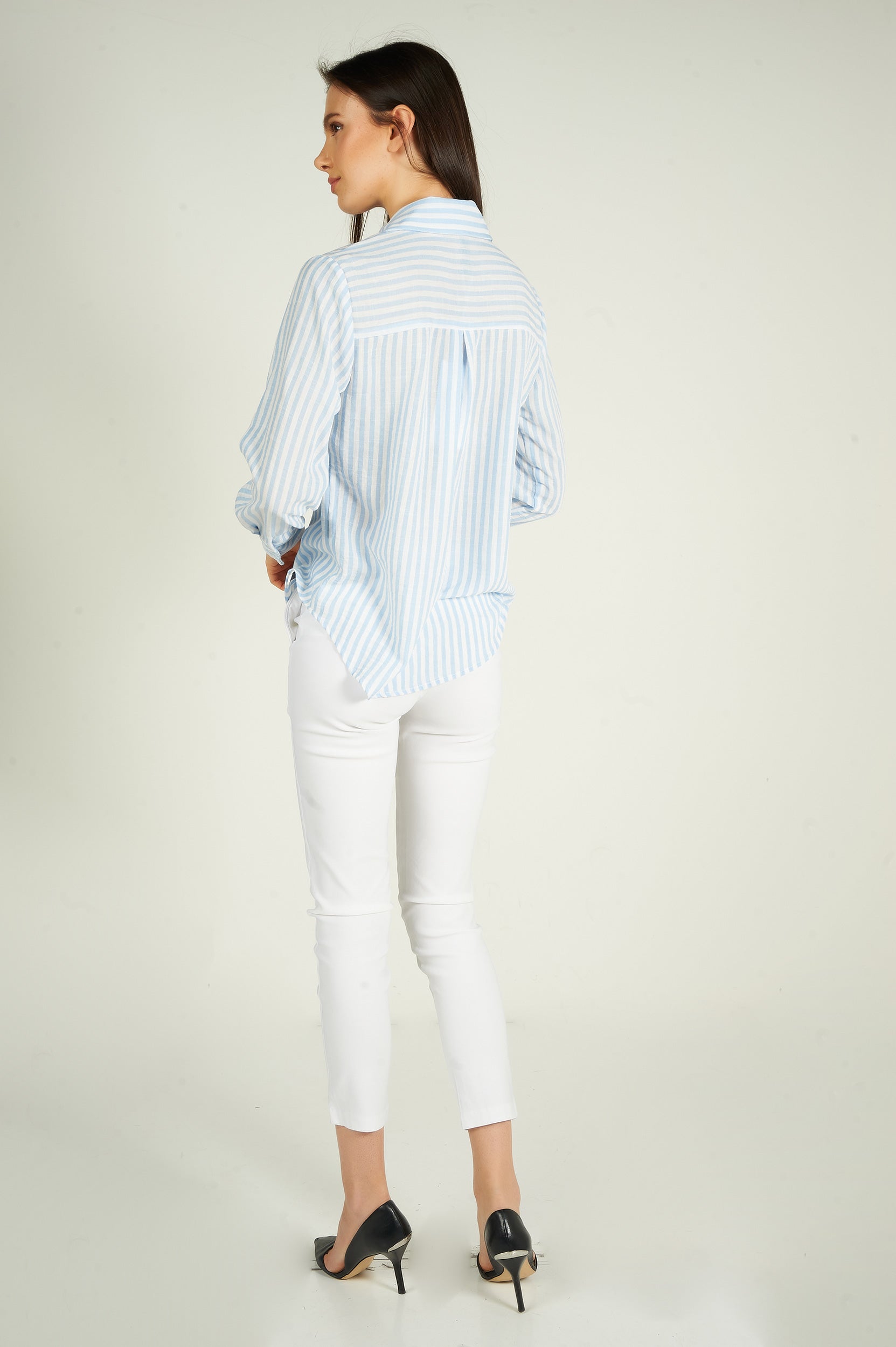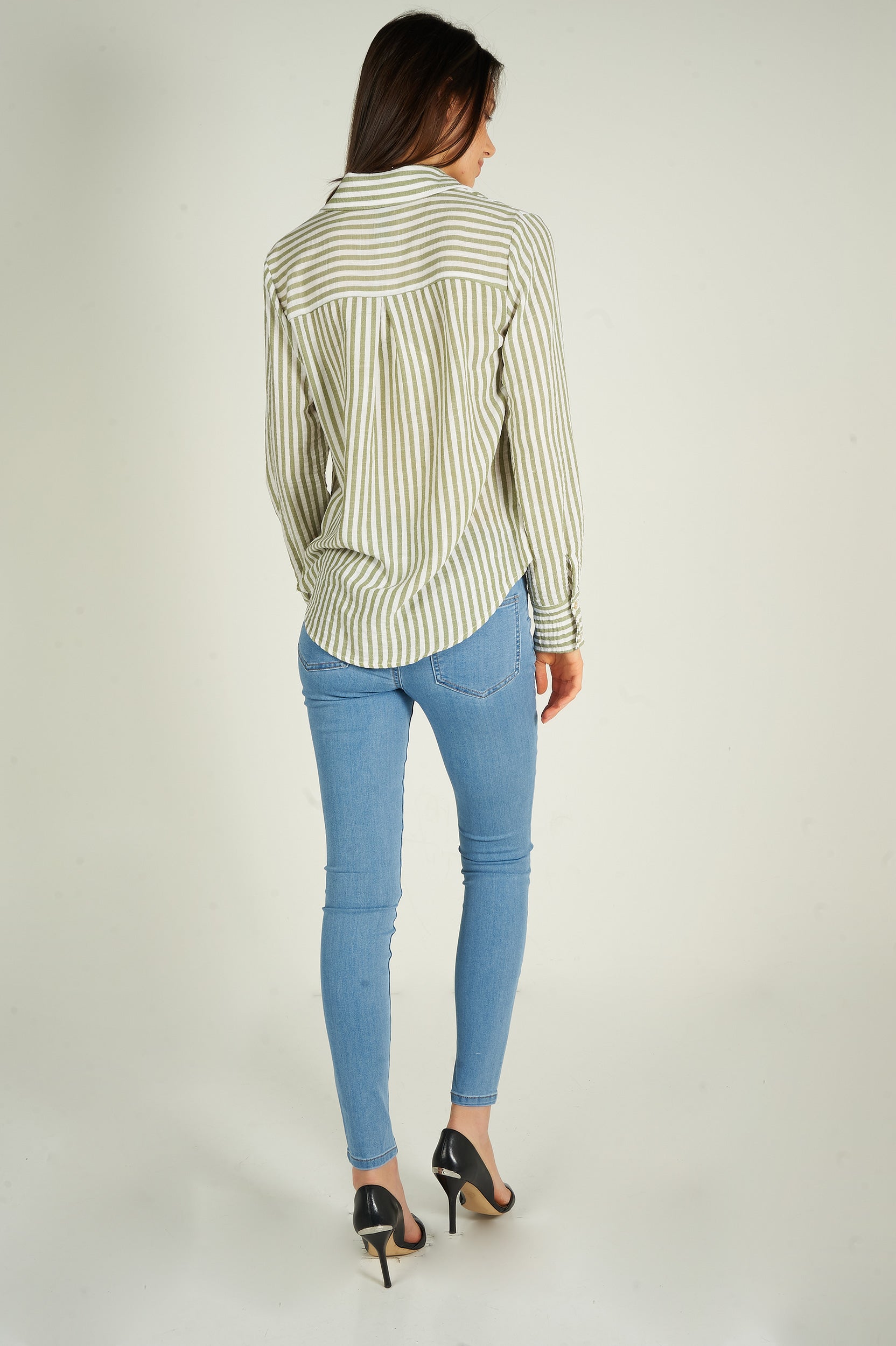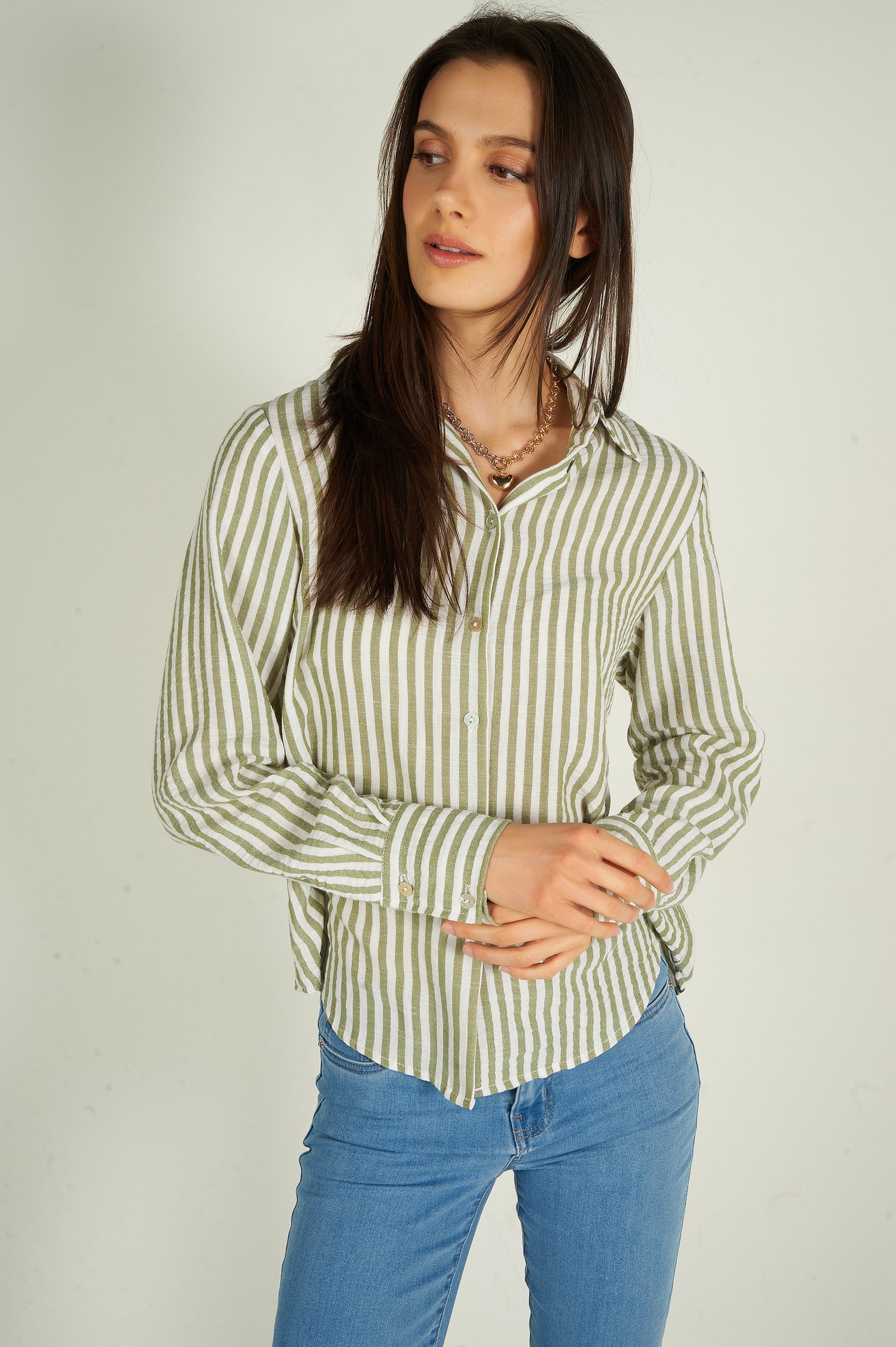 Rehaussez votre garde-robe avec la blouse pour femme Goldy, une blouse chic et polyvalente. Ce chemisier à rayures est tendance et élégant. 2 choix : blouse blanche et bleue, blouse blanche et verte.