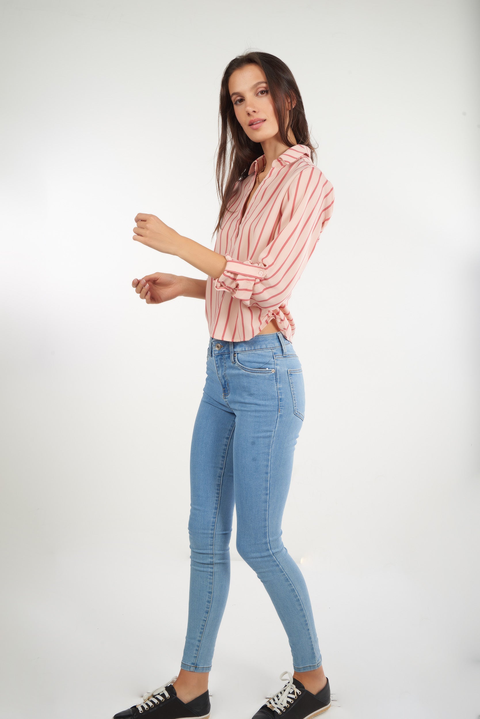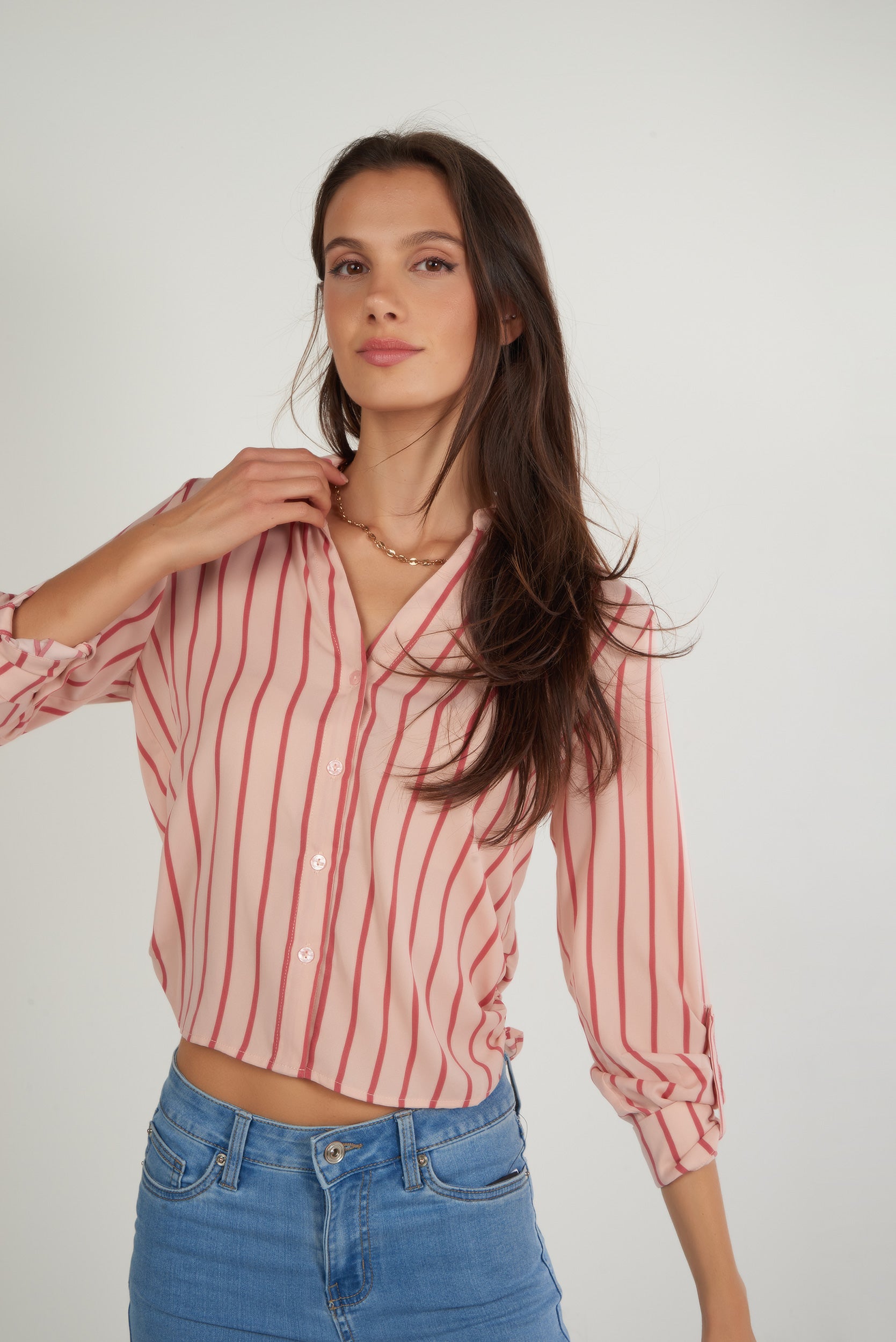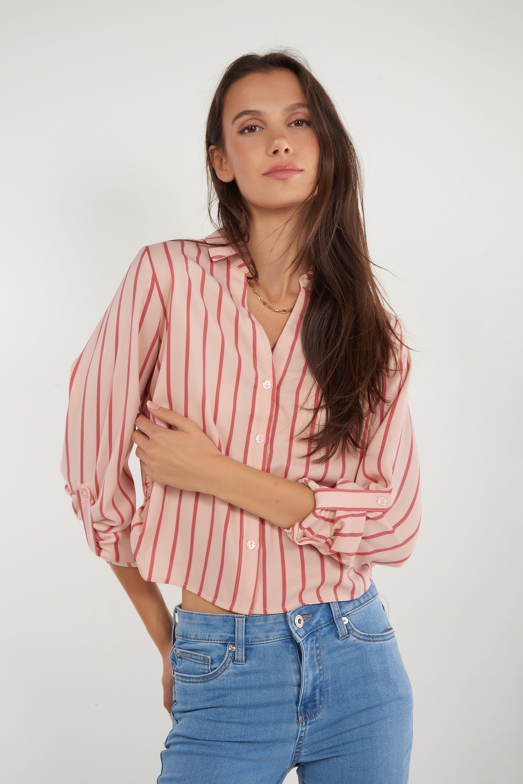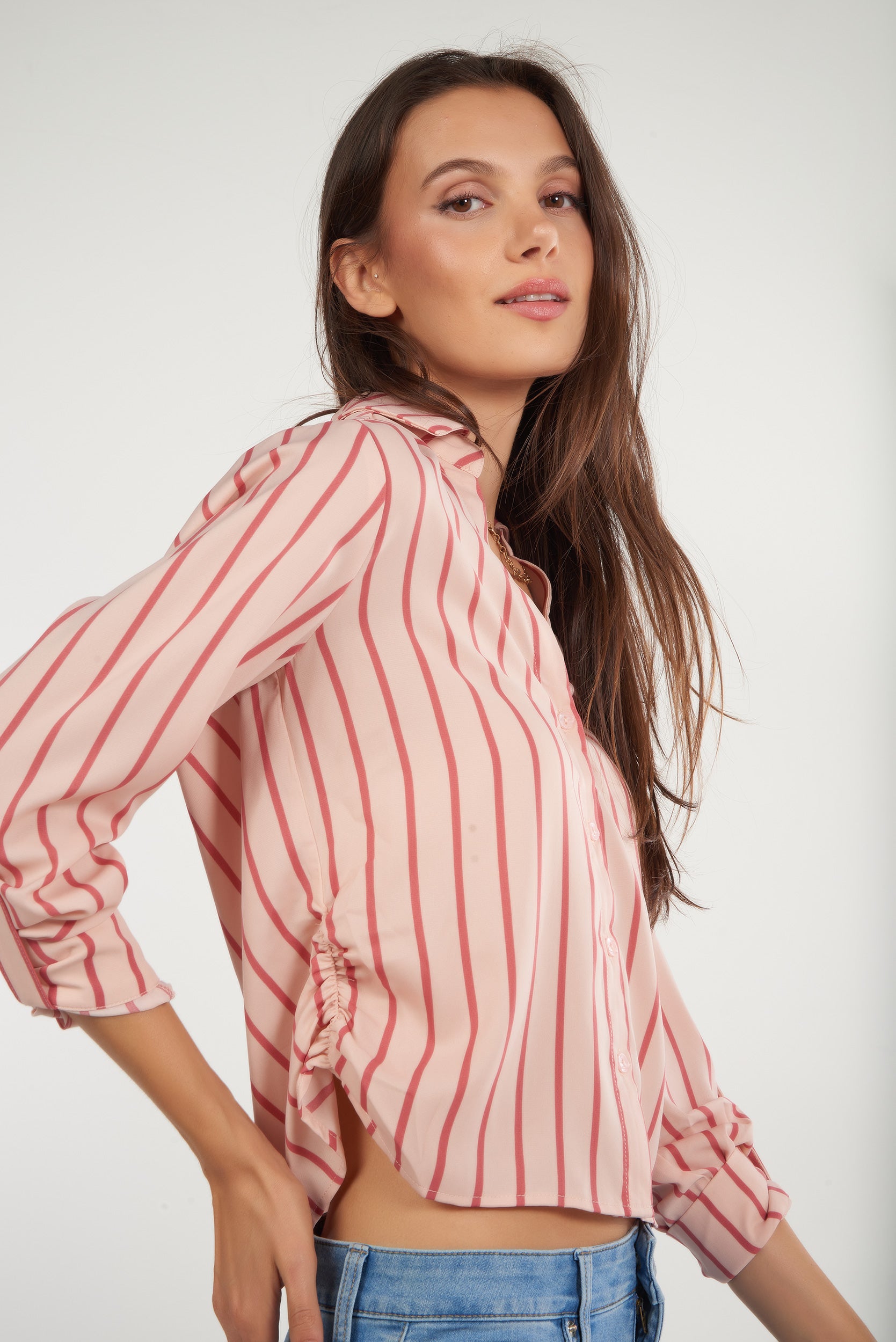 Rehaussez vos tenues décontractées avec notre blouse rayée pour femme, la blouse courte, CARMELAY2S. Cette chemise pour femme est légère, dotée de manches trois-quarts, d’un col classique et de fronces sur les côtés. LA pièce parfaite pour rendre tous vos looks uniques!