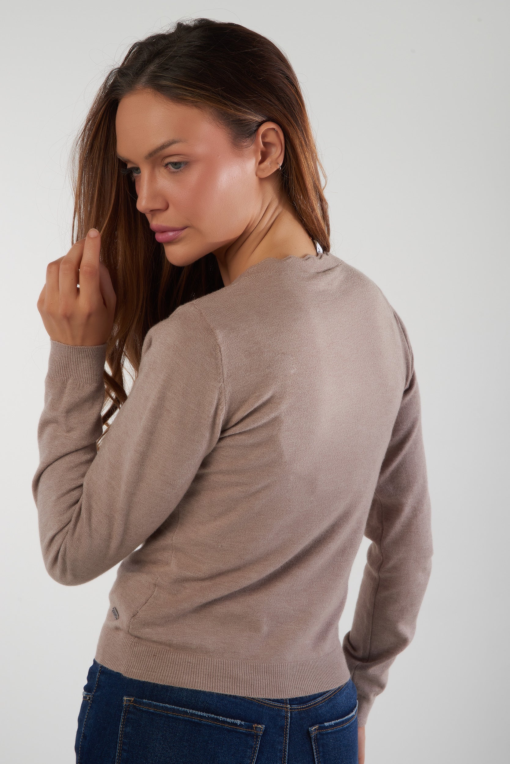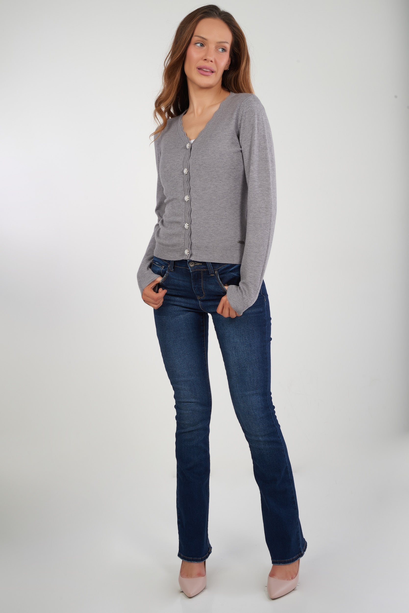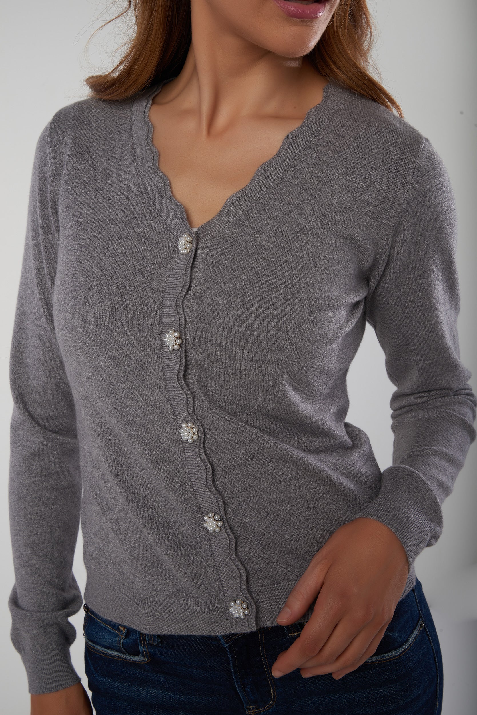 Ajoutez une touche d'élégance et de classe à vos looks du quotidien avec nos chandails pour femme, en particulier le cardigan festonné Bruna. Ce haut pour femme, doté d'une coupe courte, d’un col en V, de bordures côtelées et de boutons en perles, est l’essentiel parfait pour sublimer aussi bien les looks décontractés de la journée que les tenues plus chics du soir. Disponible en deux couleurs : gris et taupe.