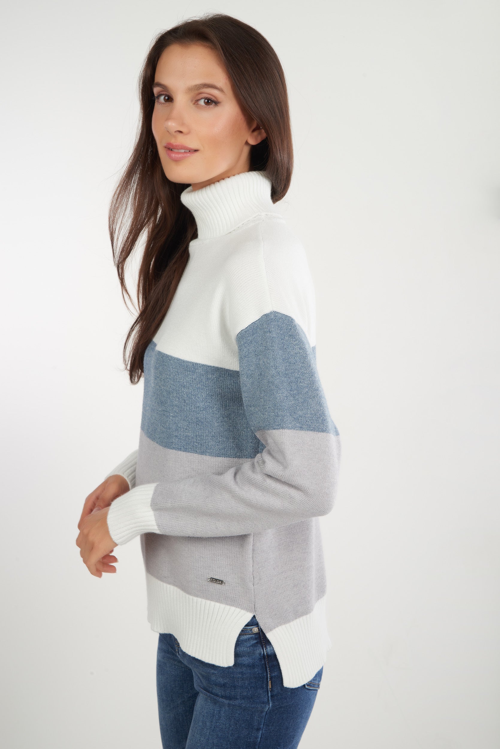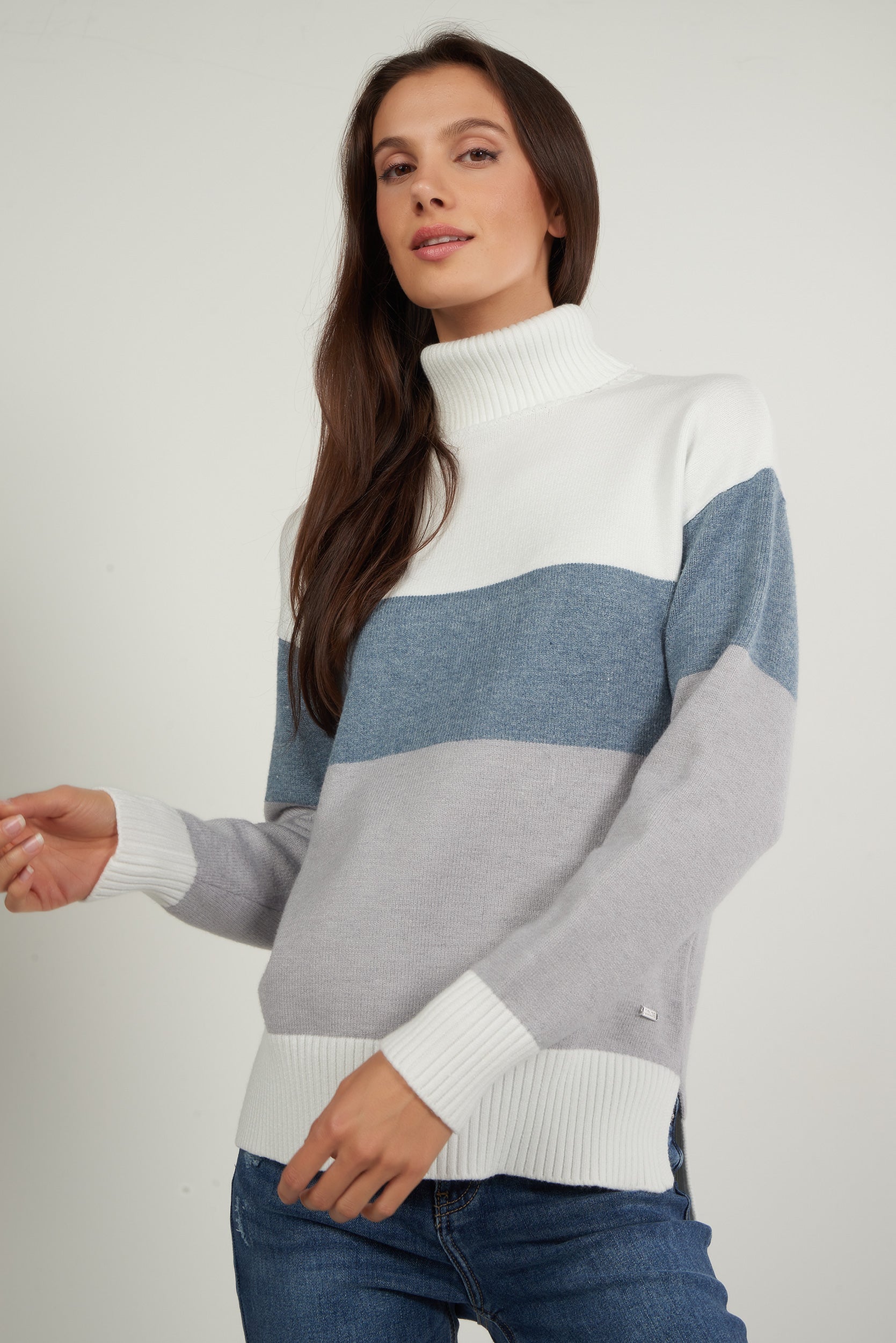 Découvrez nos chandails pour femme et tombez sous le charme de nos tricots colorés, dont le chandail Ancolie-25. Ce haut rayé à blocs de couleurs, avec col roulé, bordures côtelées et fentes latérales, est parfait pour un look élégant alliant confort et chaleur.