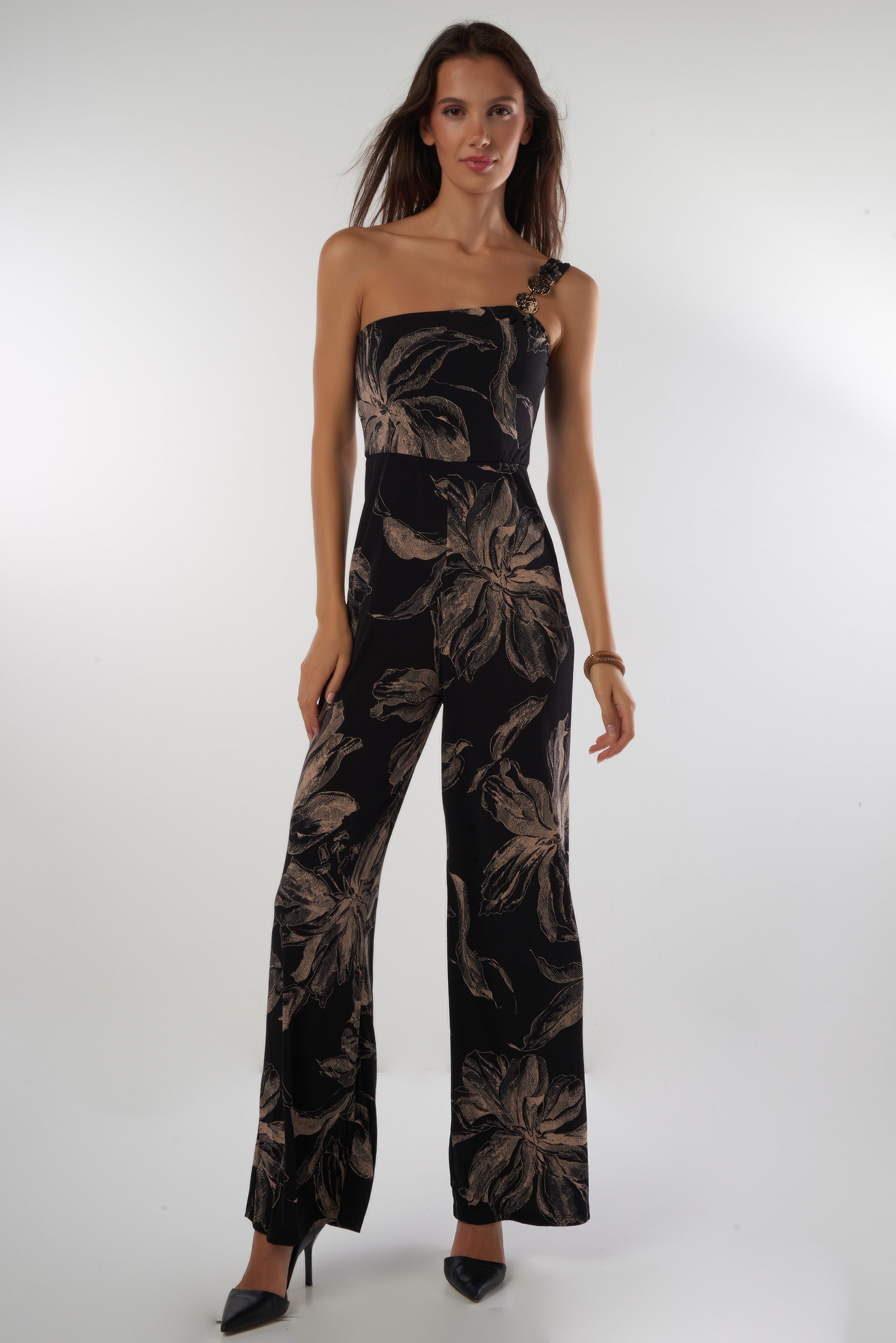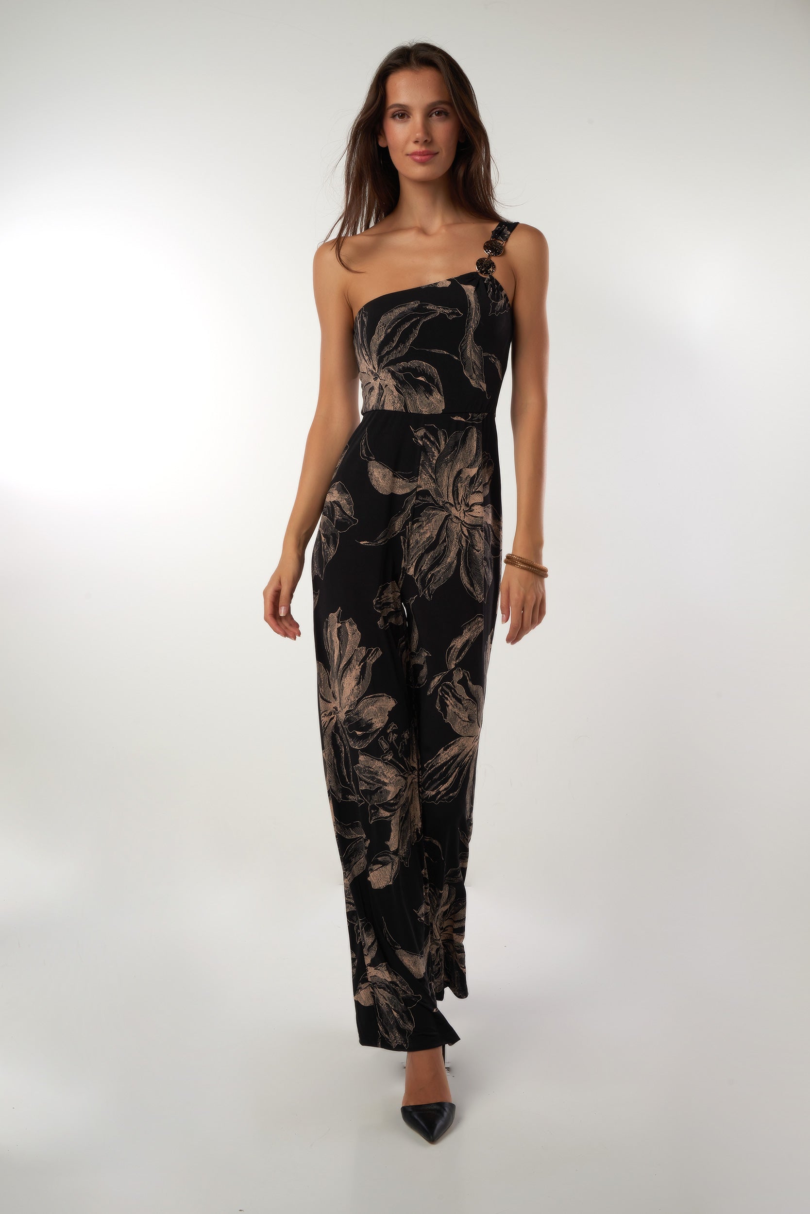Élégance, originalité et confort... c'est ce que vous procure notre combinaison pour femme DP4487. Cette combinaison à bretelle large et unique est la pièce parfaite pour vous mettre en valeur avec son look asymétrique, ses jambes larges, son imprimé fleuri et ses détails dorés.