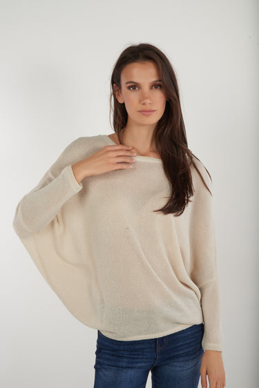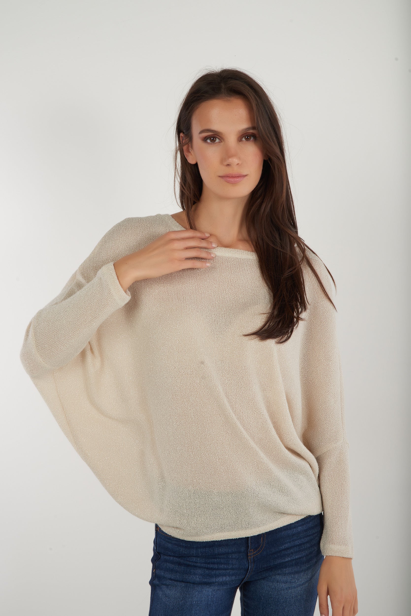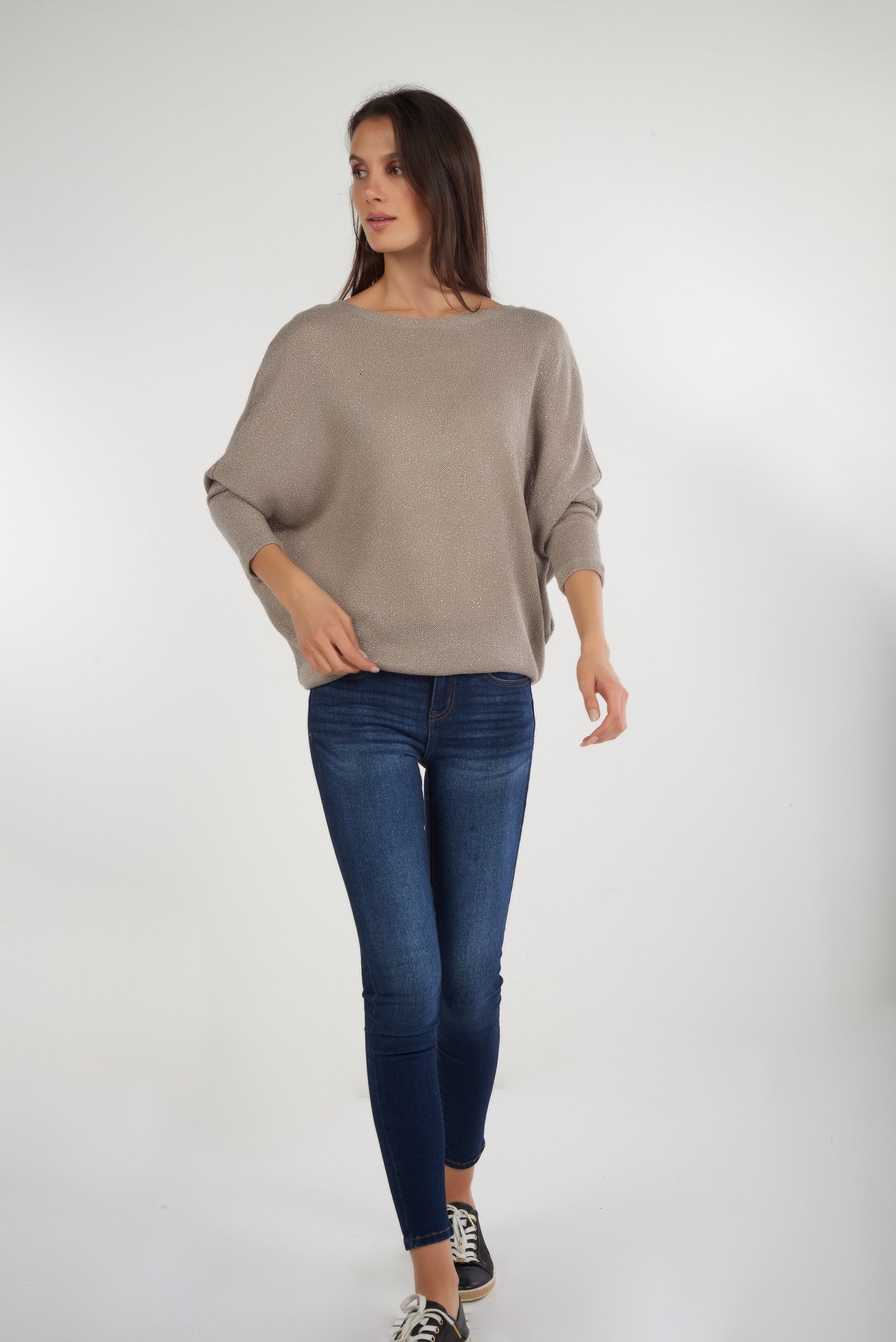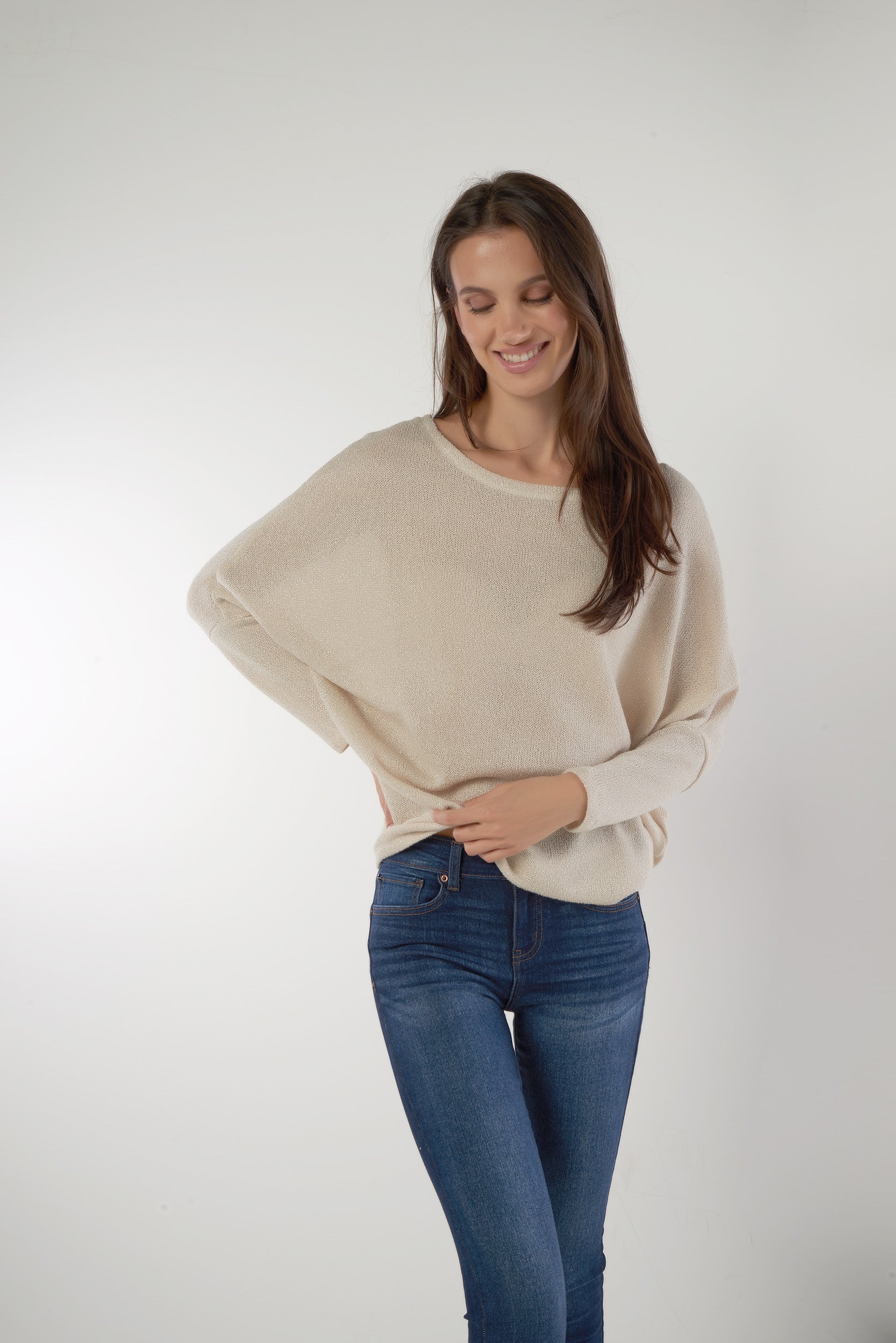 Découvrez notre collection de chandails pour femmes et laissez-vous séduire par le haut parfait pour sublimer aussi bien vos looks décontractés que vos tenues de soirée, Kaleeh. Ses manches chauve-souris, son encolure bateau et son effet brillant ne vous décevront pas! Disponible en trois couleurs: haut blanc cassé, haut noir et haut taupe.
