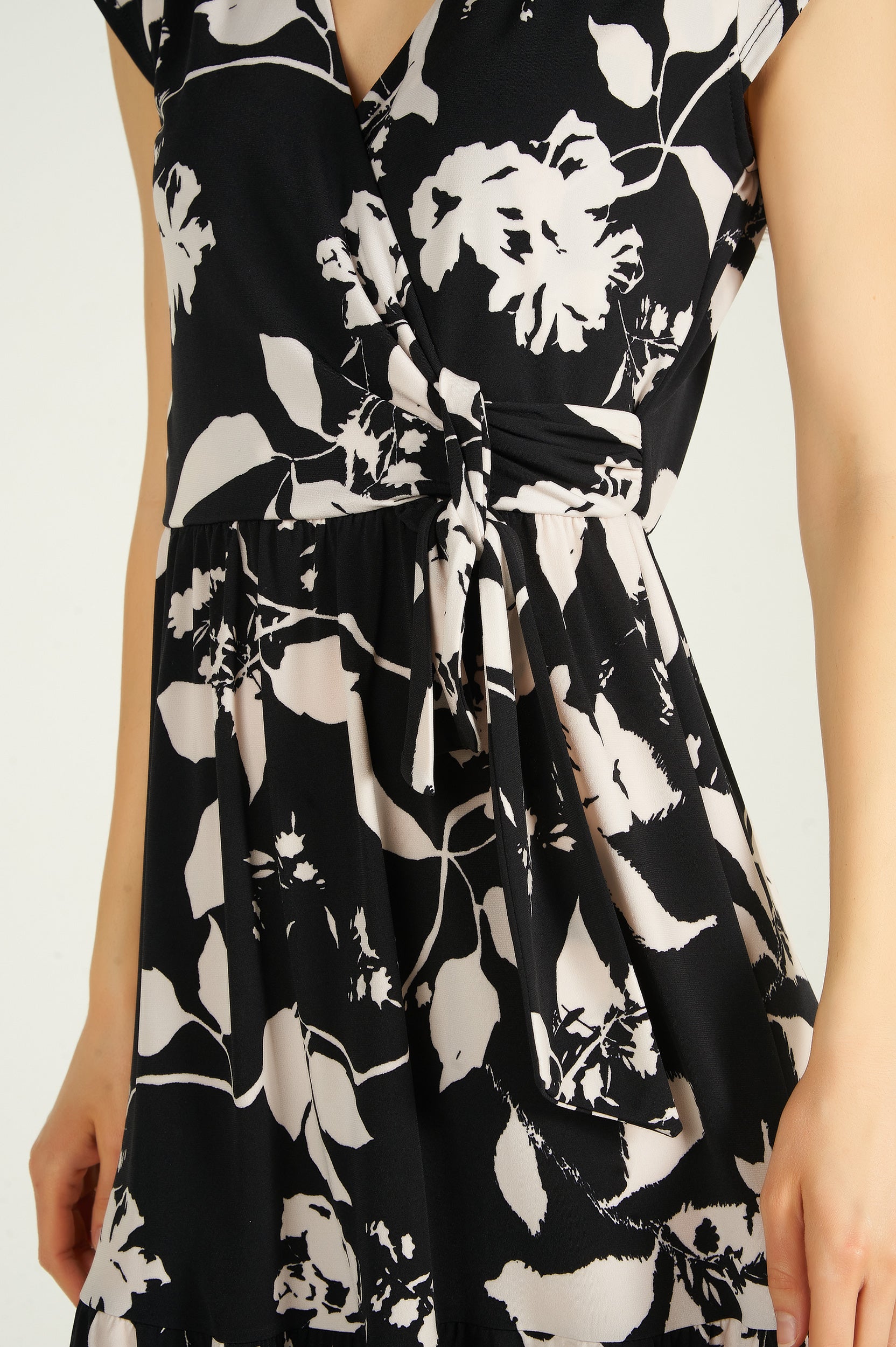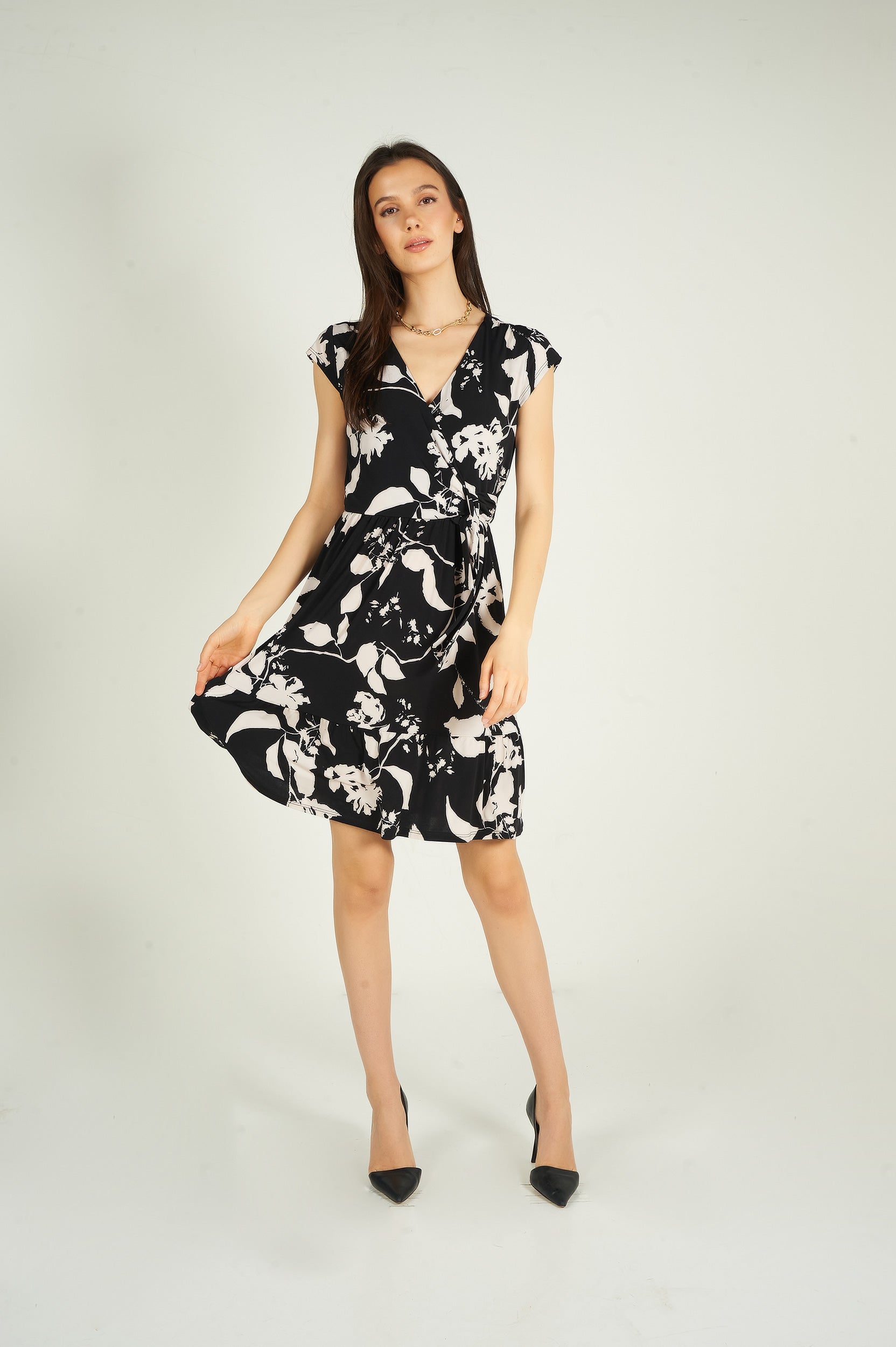 Magasinez nos robes pour femme, dont la magnifique robe courte Axelle-PY1. Tombez sous le charme de notre robe cache-coeur, robe sans manches, robe noire avec des motifs floraux blancs.
