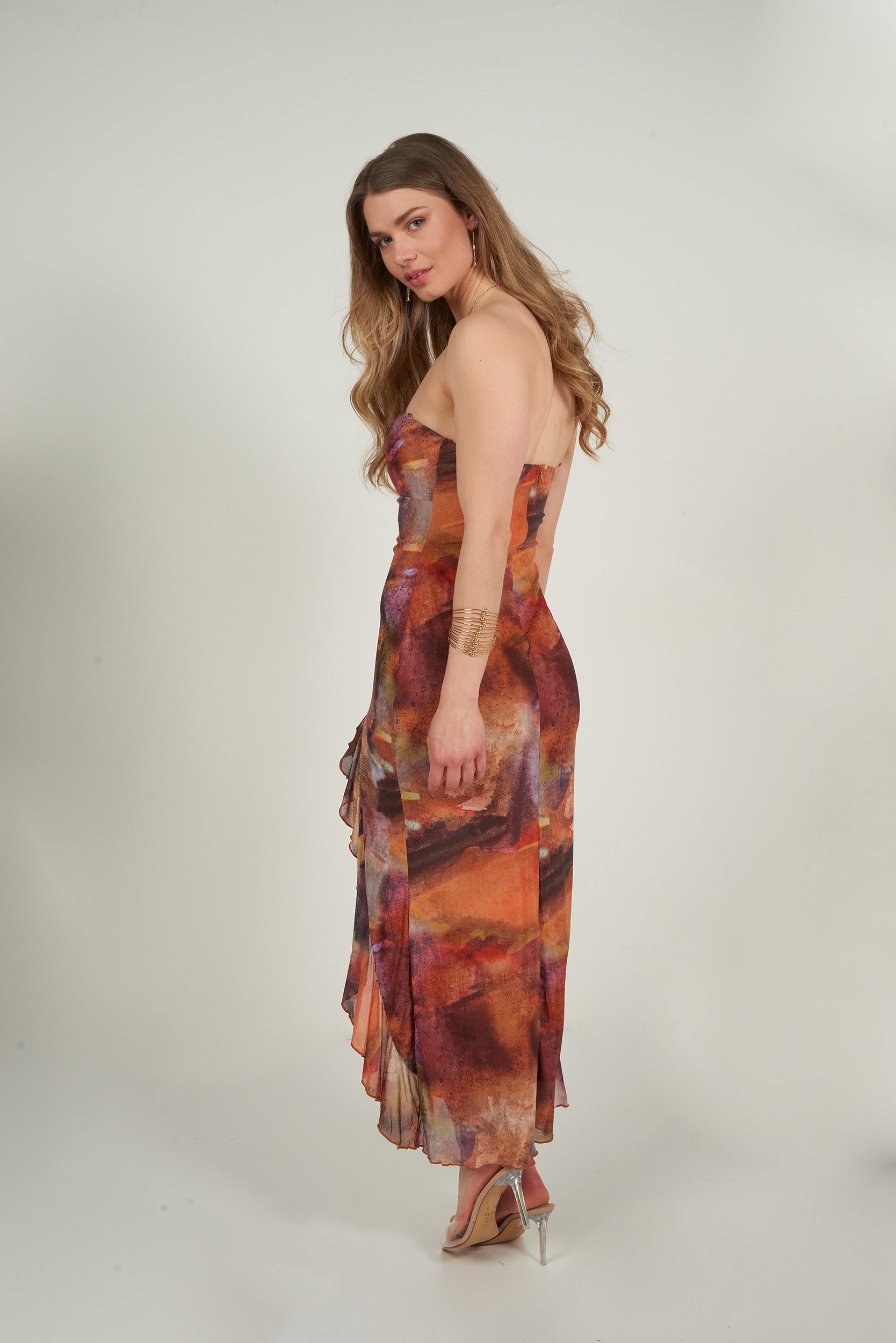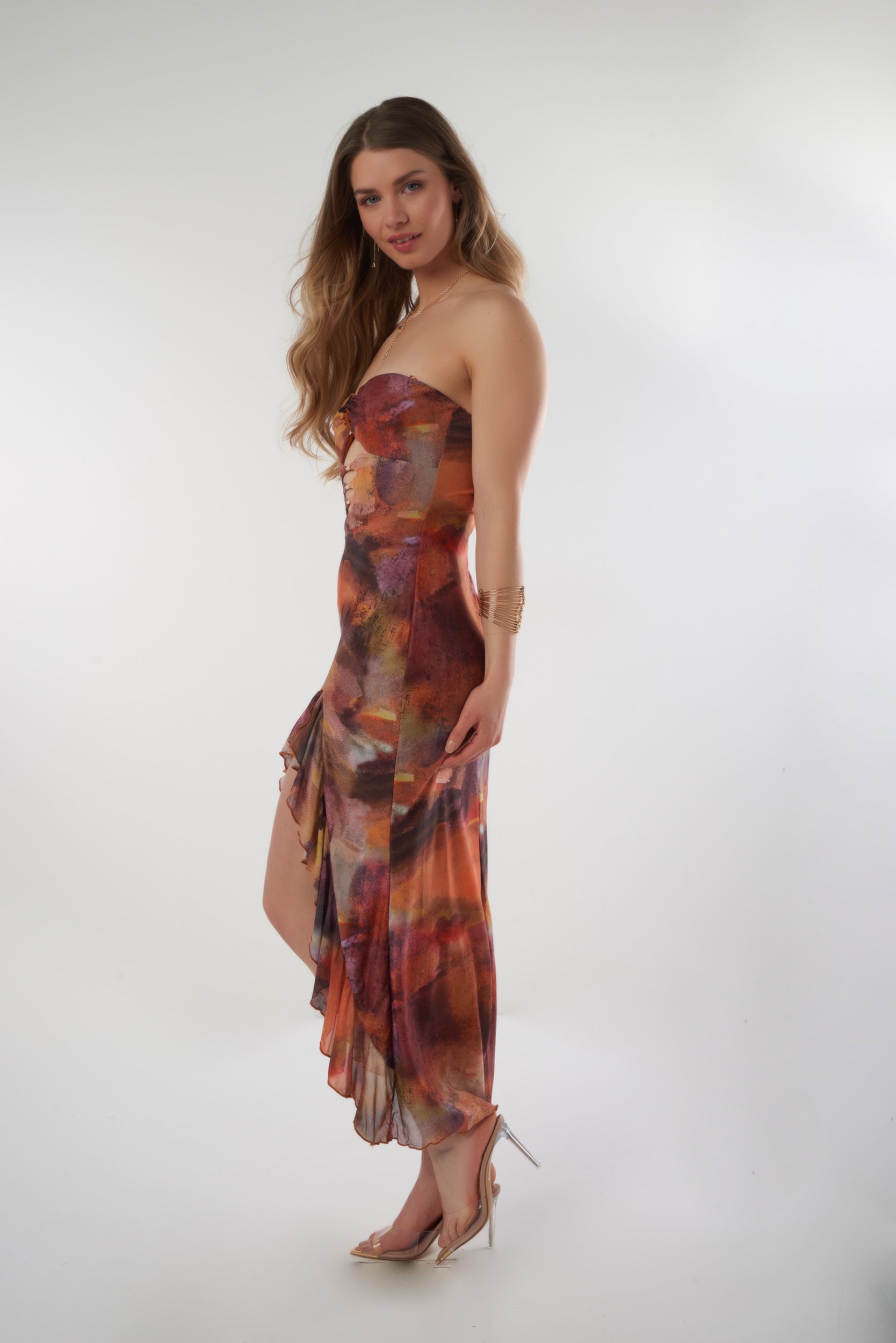 Laissez-vous séduire par cette robe longue au style glamour, parfaite pour faire tourner toutes les têtes. Son imprimé artistique aux tons chauds et vibrants apporte une allure unique et sophistiquée. Avec son bustier structuré et ses détails lacés, elle sublime la silhouette avec une touche de féminité audacieuse.
