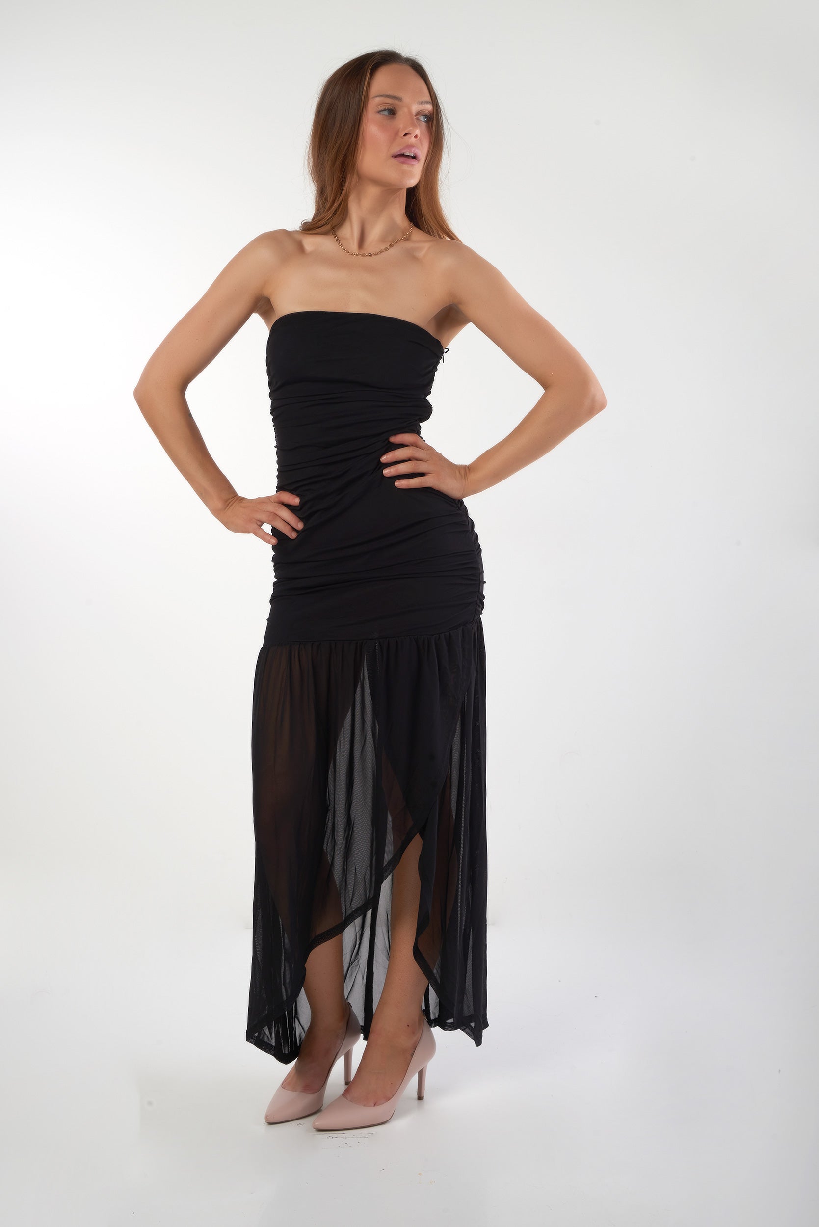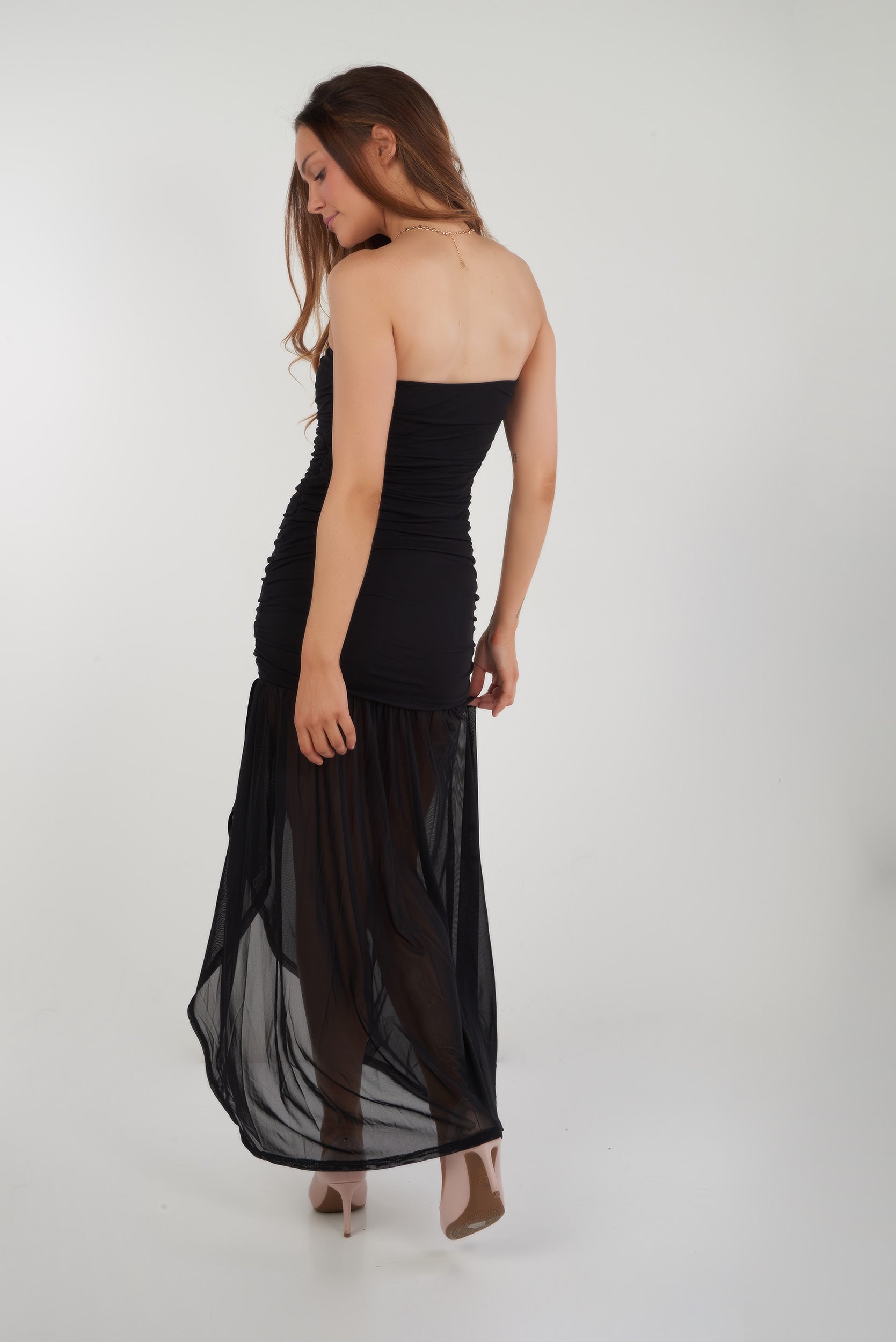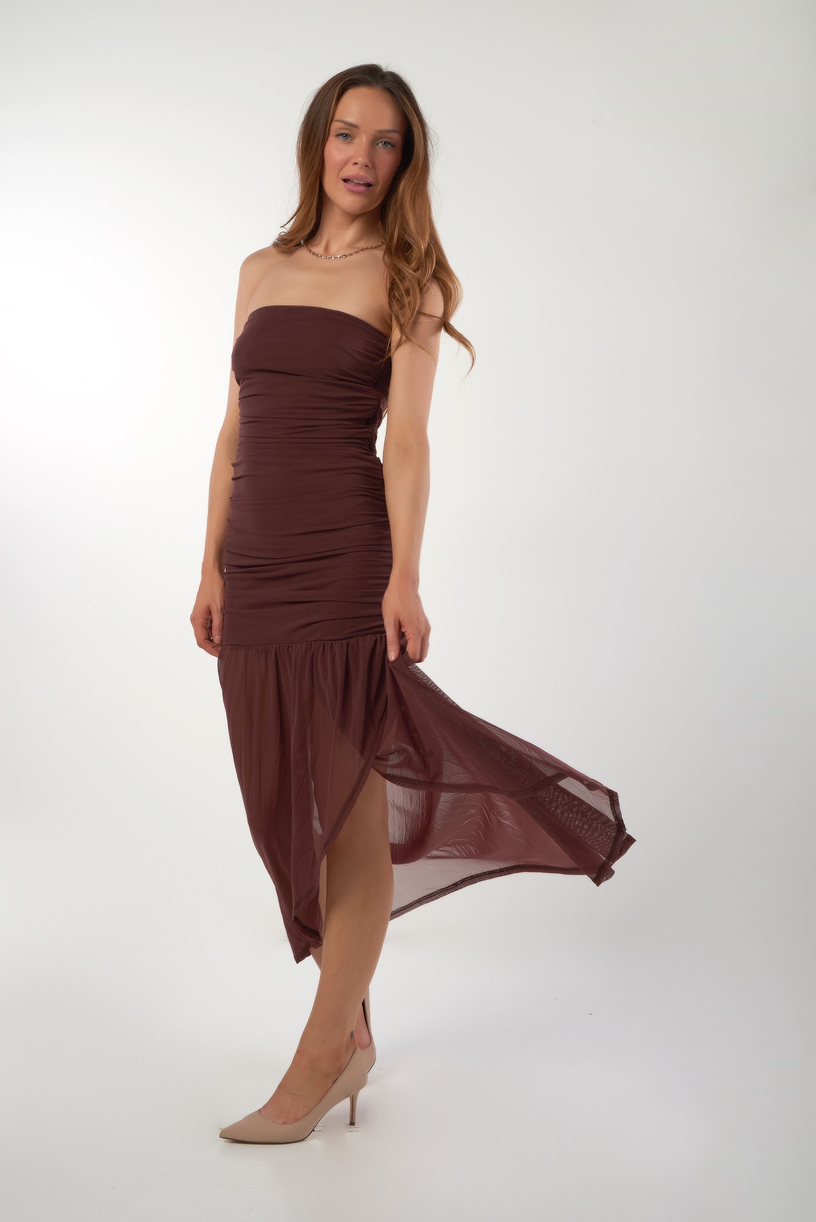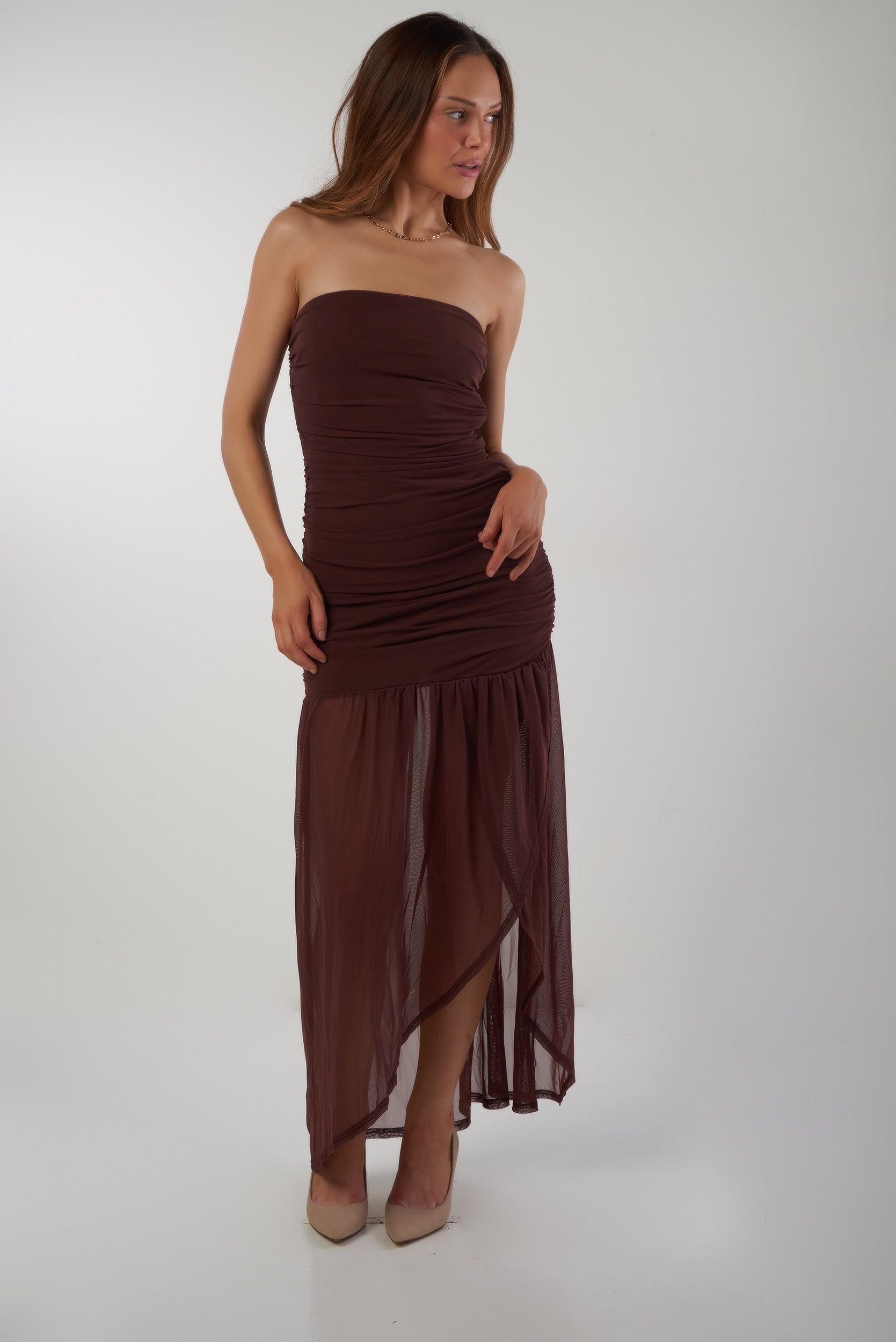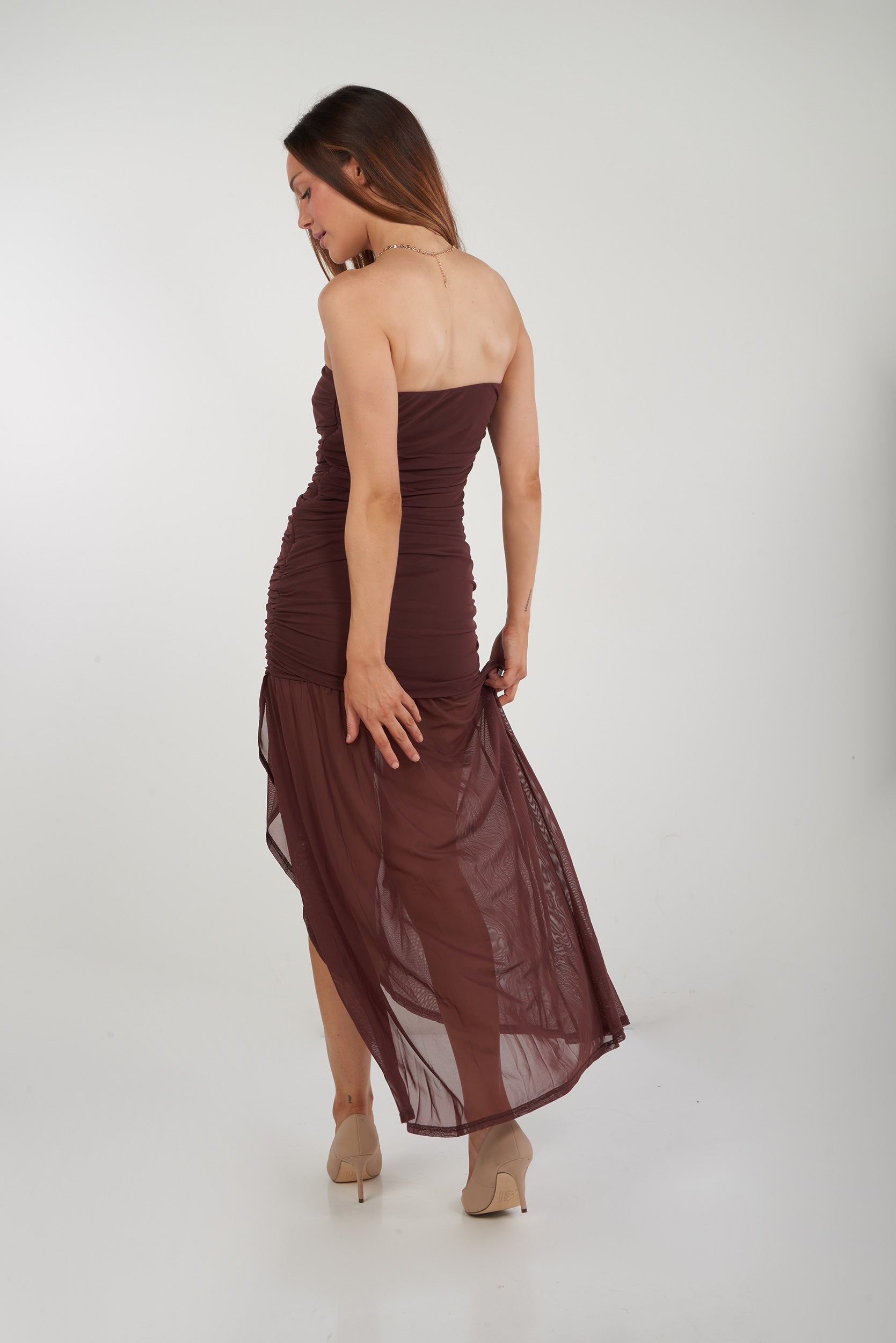 Ajoutez à votre garde-robe nos robes pour femme, en particulier la robe parfaite pour vos occasions préférées : la robe en mesh MD2518. Sa coupe moulante, son haut en bustier, son bas asymétrique et son effet drapé font d'elle une robe maxi hors du commun. Disponible en deux couleurs: robe brune et robe noire.
