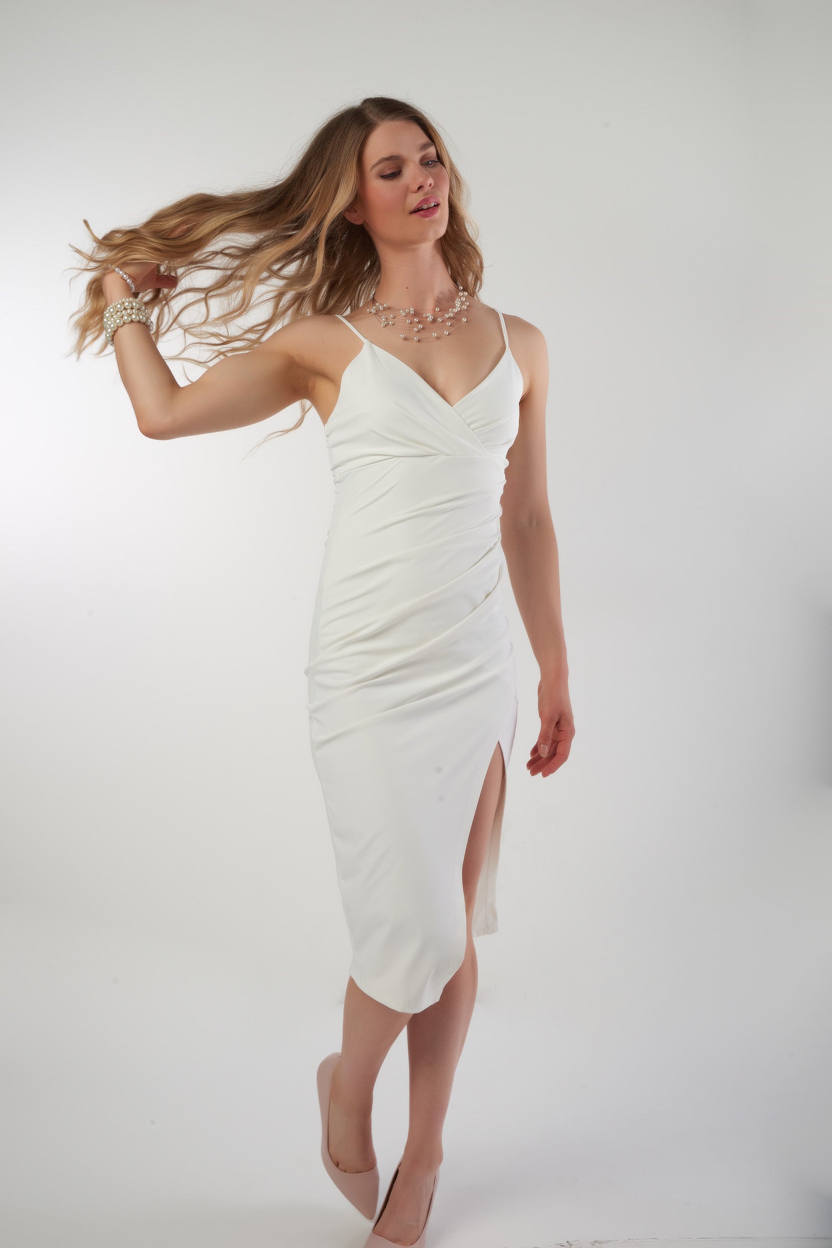 Découvrez nos superbes robes pour femme, dont le modèle CAMIL-CALI. Une robe mi-longue, à la coupe cache-coeur, avec une fente latérale. Disponible en trois choix : robe noir, robe rose et robe blanc cassé.